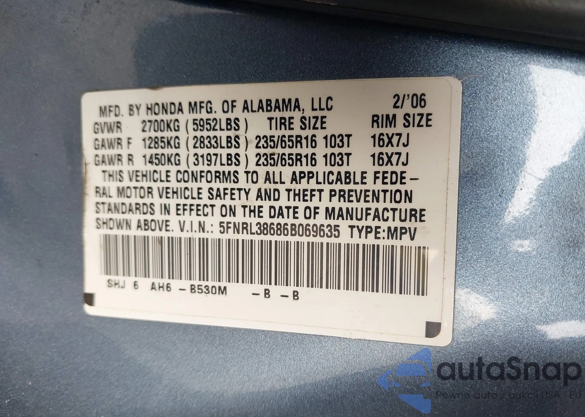 Автомобиль Honda Odyssey 2006 (VIN 5FNRL38686B069635) ранее не участвовал в торгах. Документы чистые, пробег соответствует или ниже среднего по рынку. Продаётся страховой компанией — рекомендуем покупку. Доставка в порт займет около 6–8 недель.