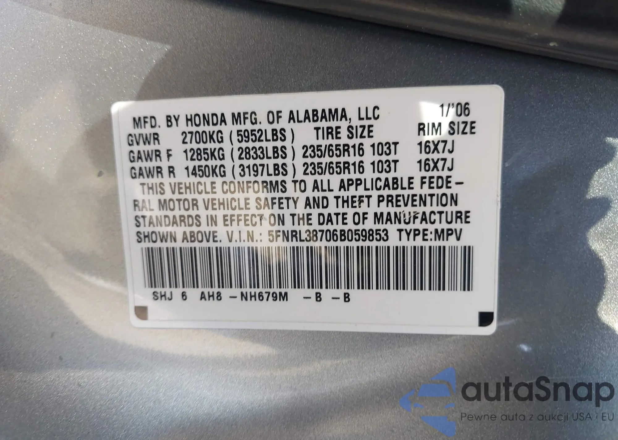 • VIN: 5FNRL38706B059853