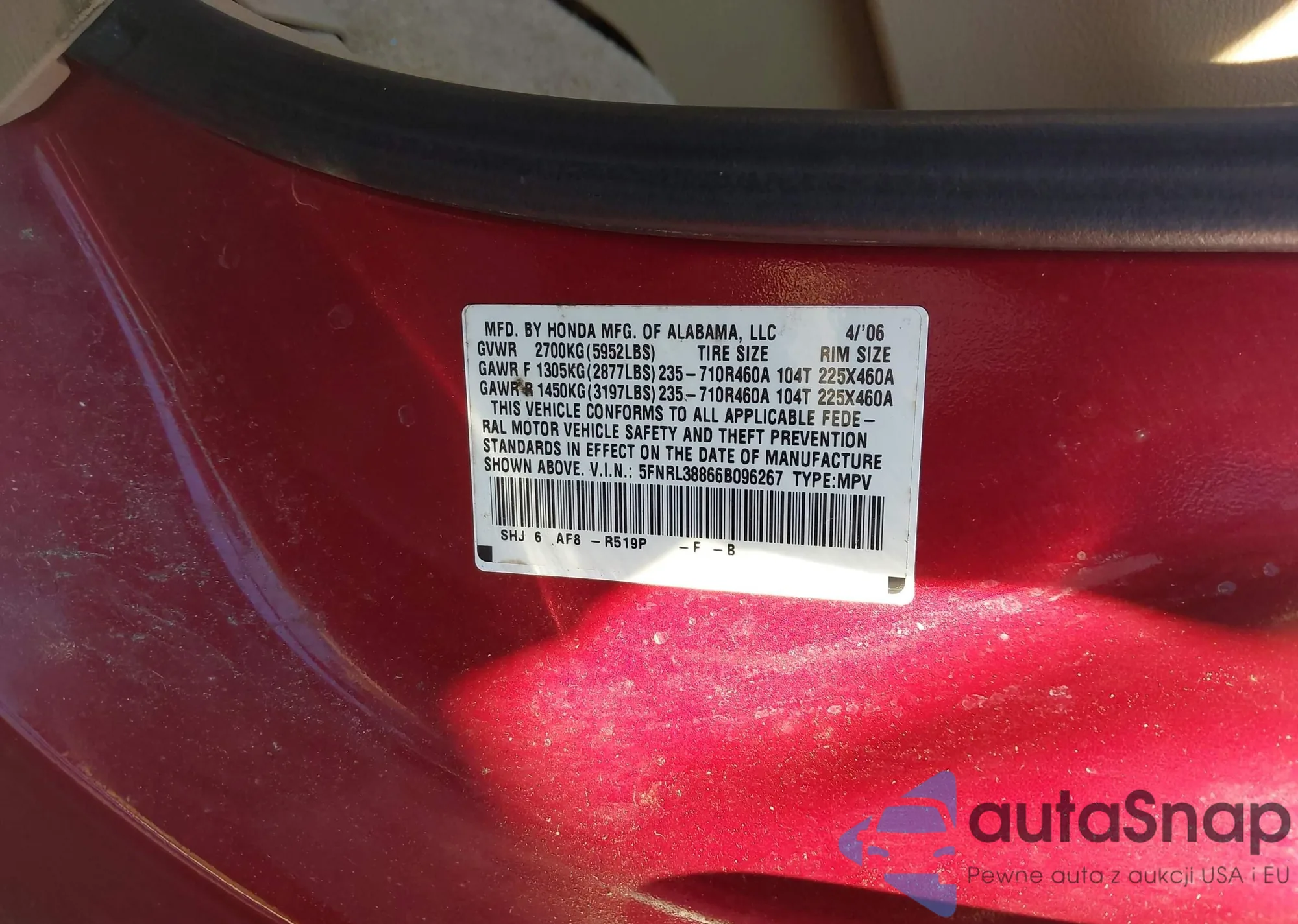 VIN: 5FNRL38866B096267
