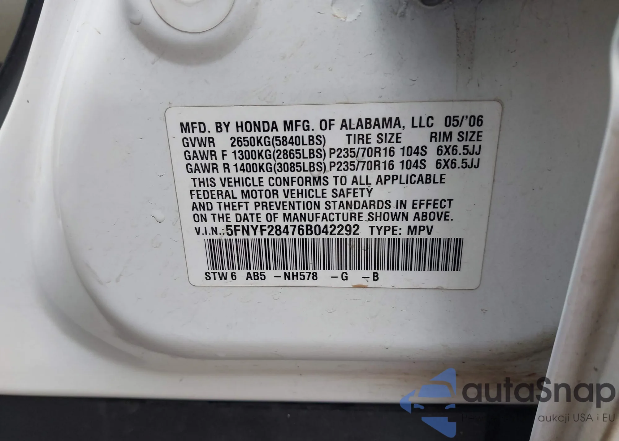 Автомобиль Honda Pilot 2006 (VIN 5FNYF28476B042292) ранее не участвовал в торгах. Документы чистые, пробег соответствует или ниже среднего по рынку. Продаётся страховой компанией — рекомендуем покупку. Доставка в порт займет около 6–8 недель.