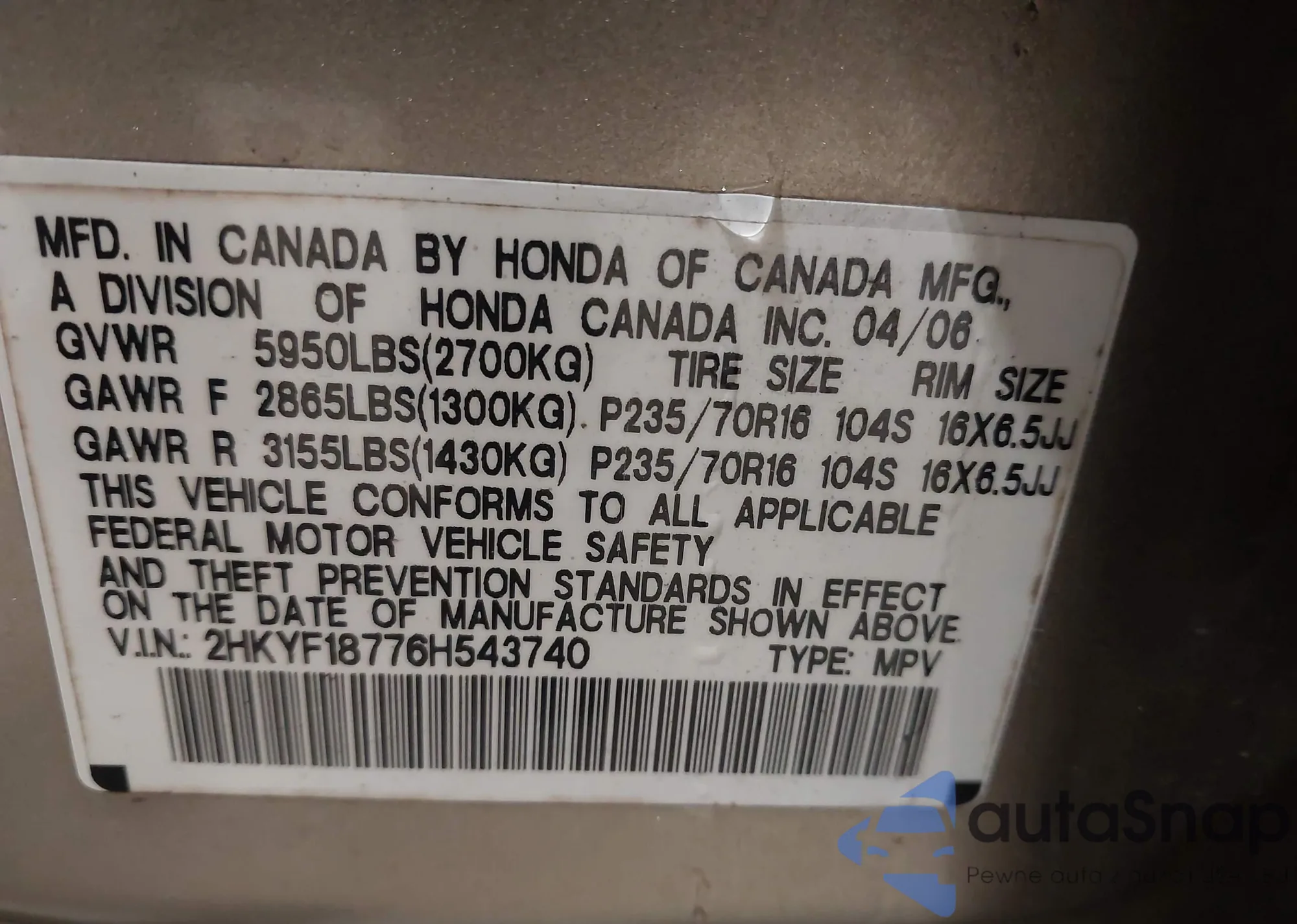 VIN: 2HKYF18776H543740