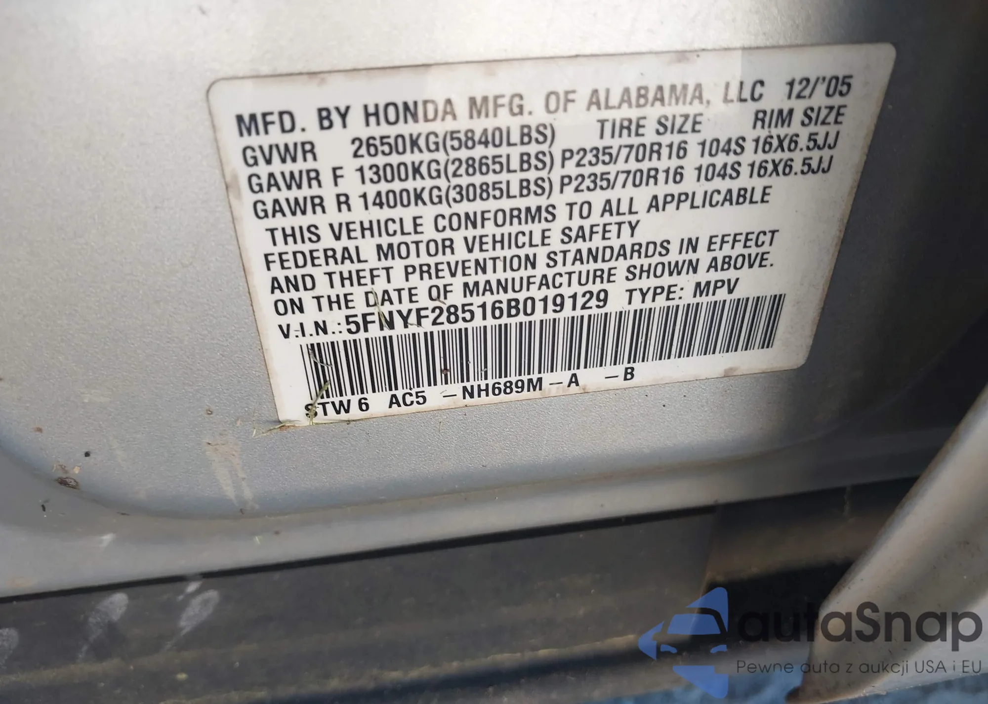 VIN: 5FNYF28516B019129