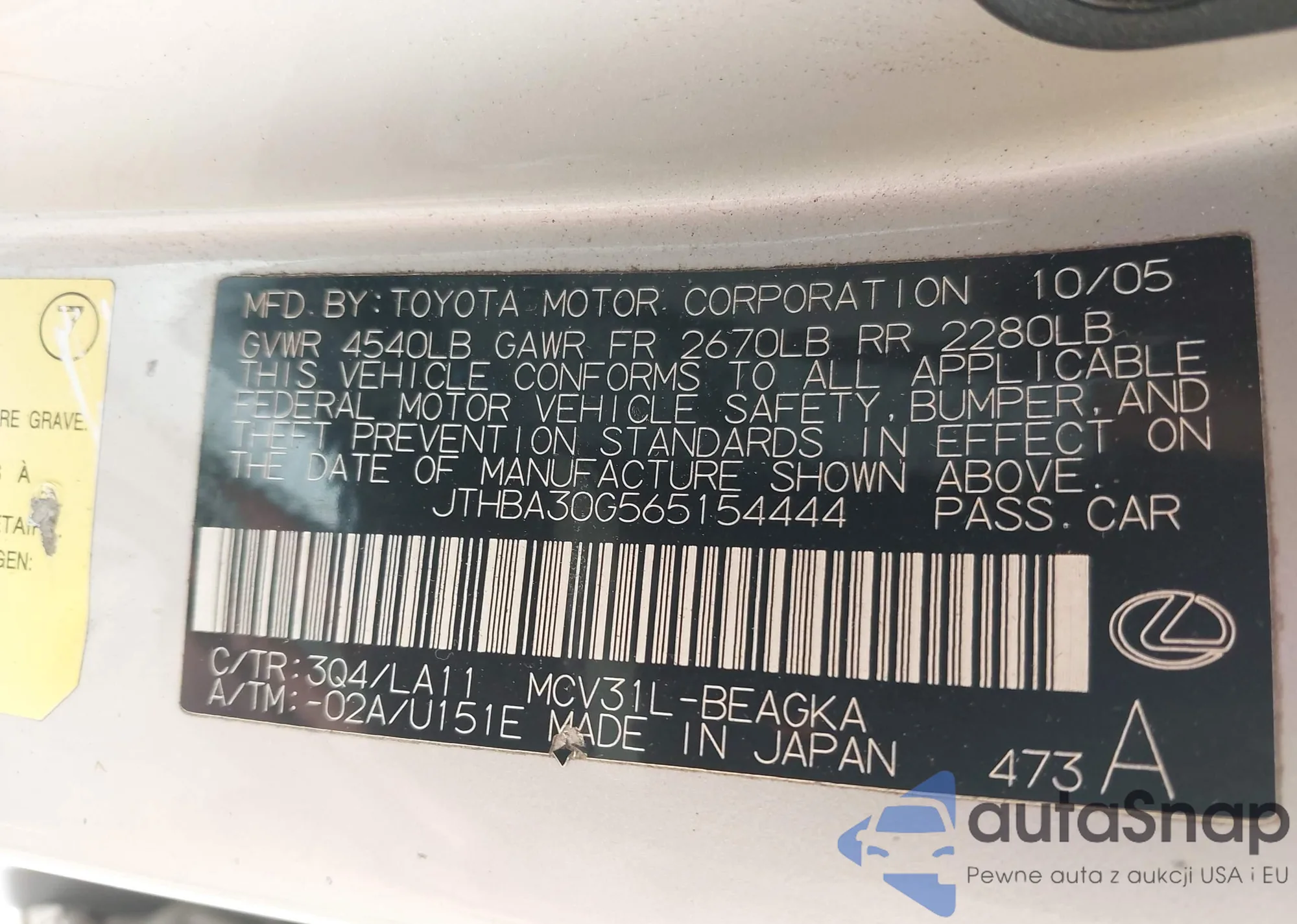 VIN: JTHBA30G565154444