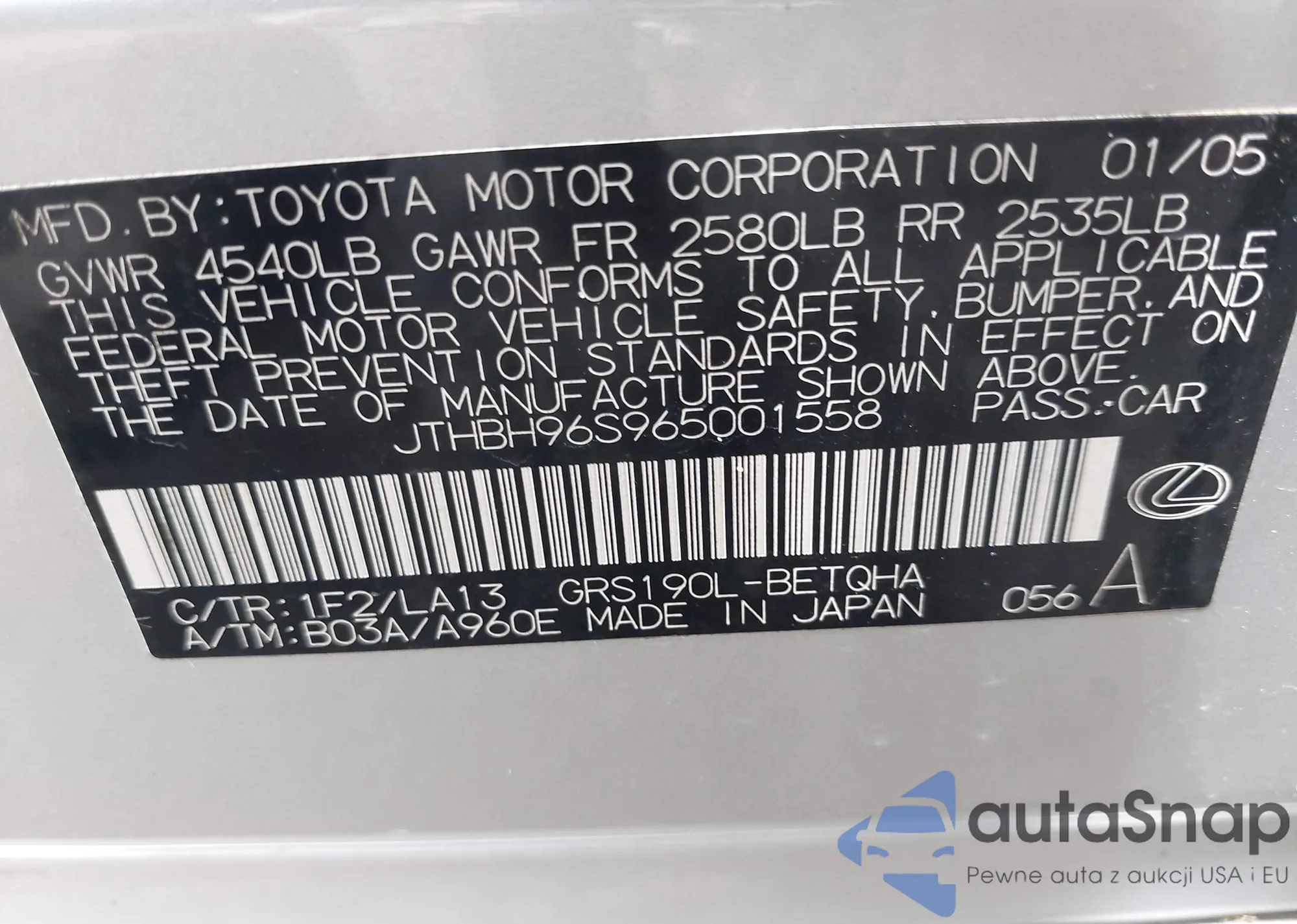 VIN: JTHBH96S965001558