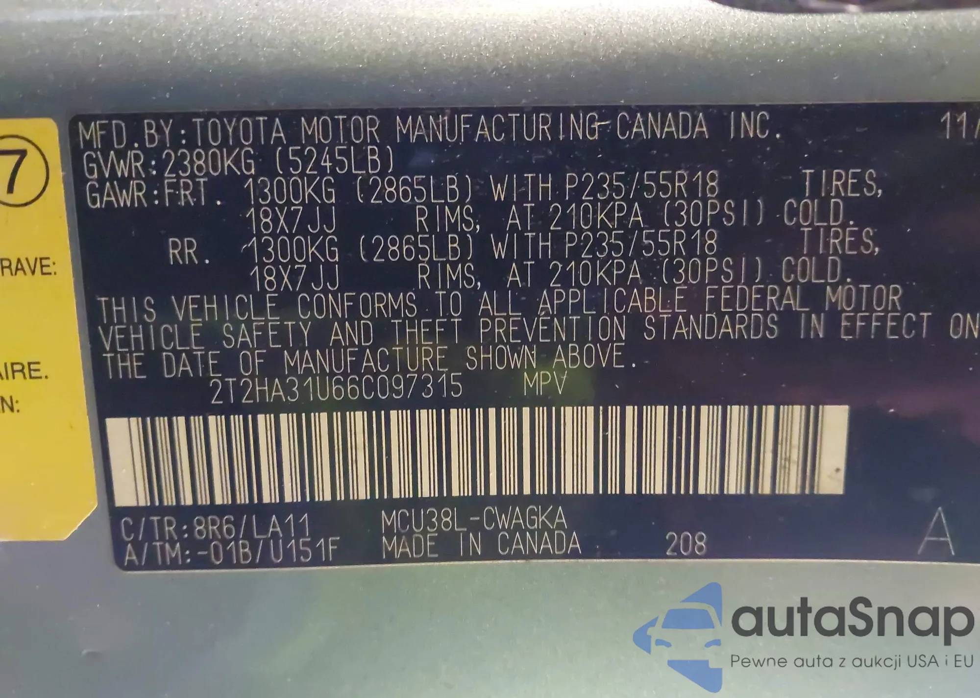VIN: 2T2HA31U66C097315