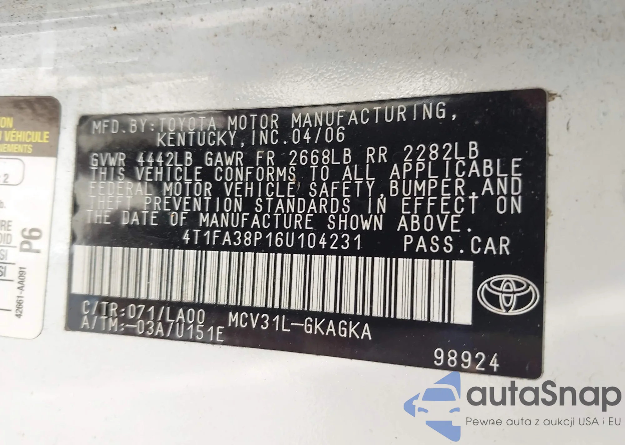 VIN: 4T1FA38P16U104231