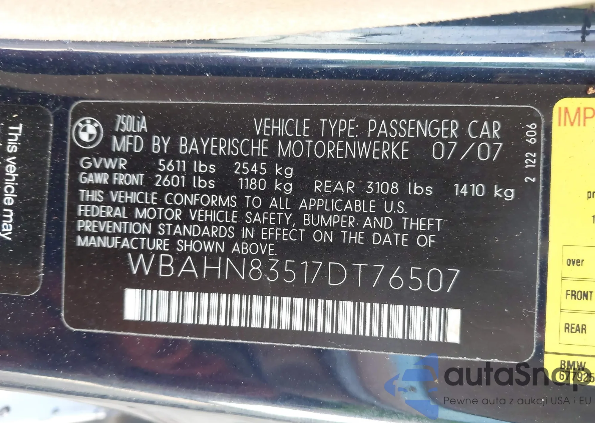Автомобиль BMW 7er 2007 (VIN WBAHN83517DT76507) имеет документы, препятствующие регистрации. Могут возникнуть сложности при экспорте и регистрации. Обратитесь к экспертам AutaSnap для поиска альтернатив.