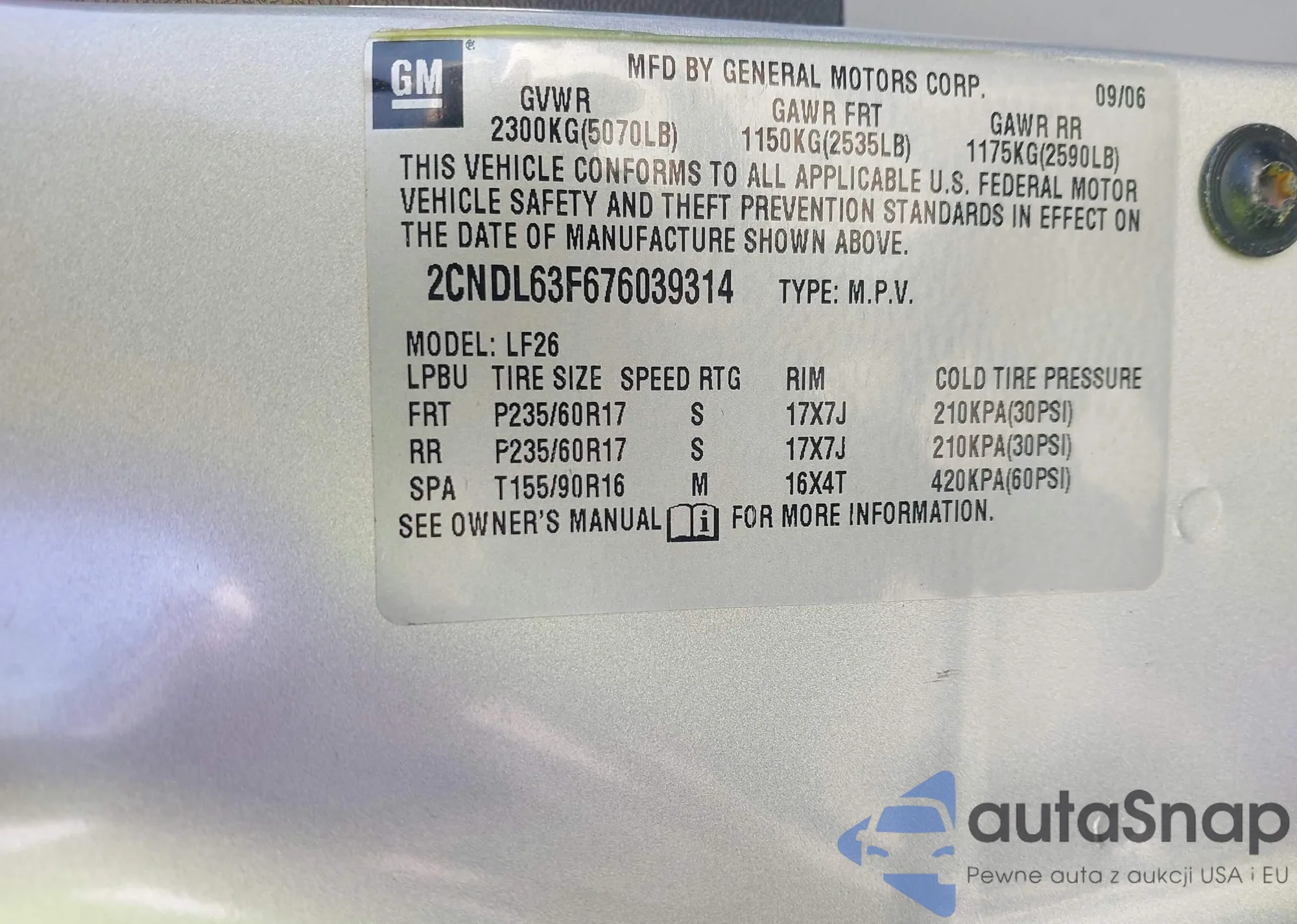 Автомобиль Chevrolet Equinox 2007 (VIN 2CNDL63F676039314) имеет документы, препятствующие регистрации. Могут возникнуть сложности при экспорте и регистрации. Обратитесь к экспертам AutaSnap для поиска альтернатив.