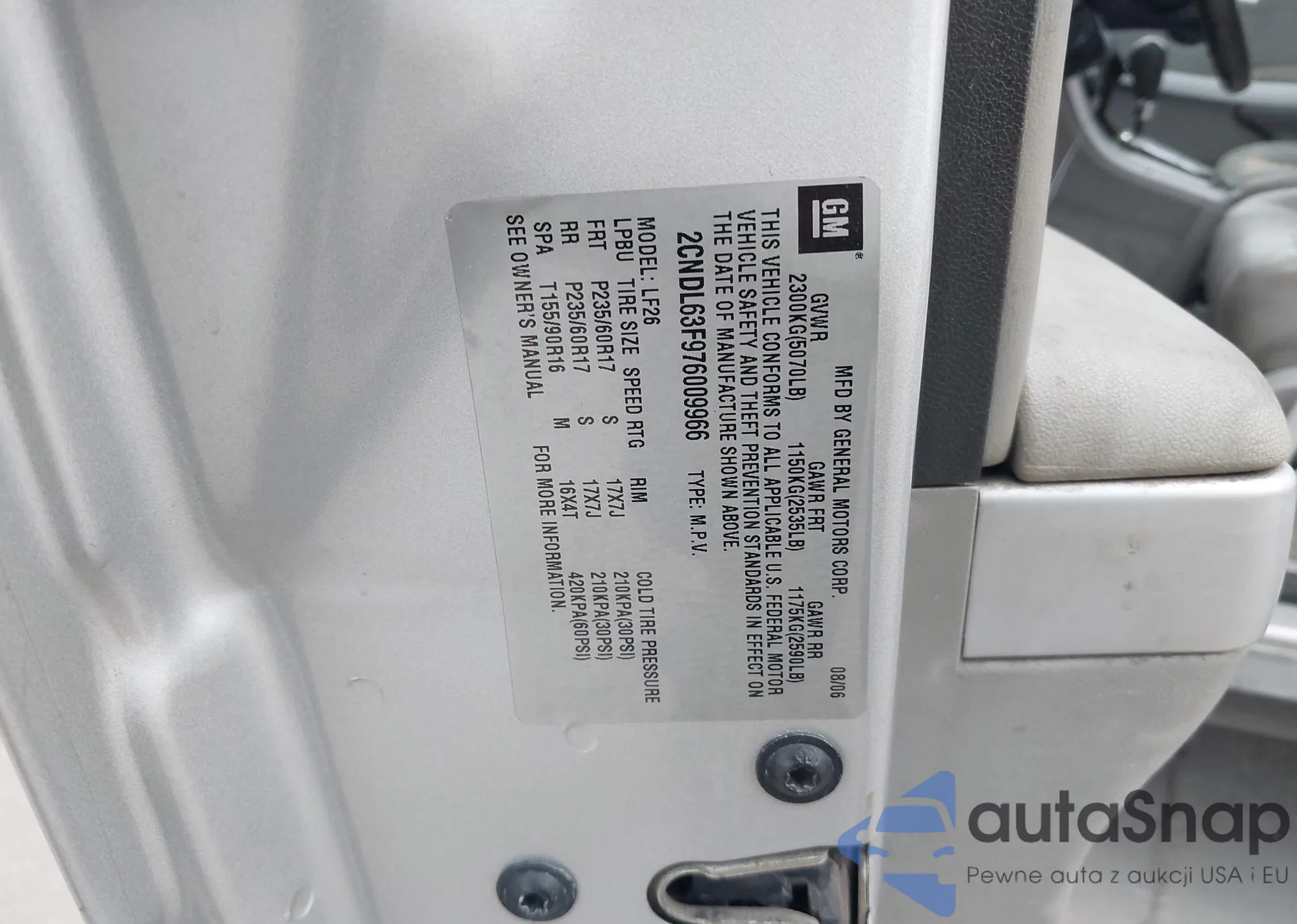 Автомобиль Chevrolet Equinox 2007 (VIN 2CNDL63F976009966) ранее не участвовал в торгах. Документы чистые, пробег соответствует или ниже среднего по рынку. Продаётся страховой компанией — рекомендуем покупку. Доставка в порт займет около 6–8 недель.