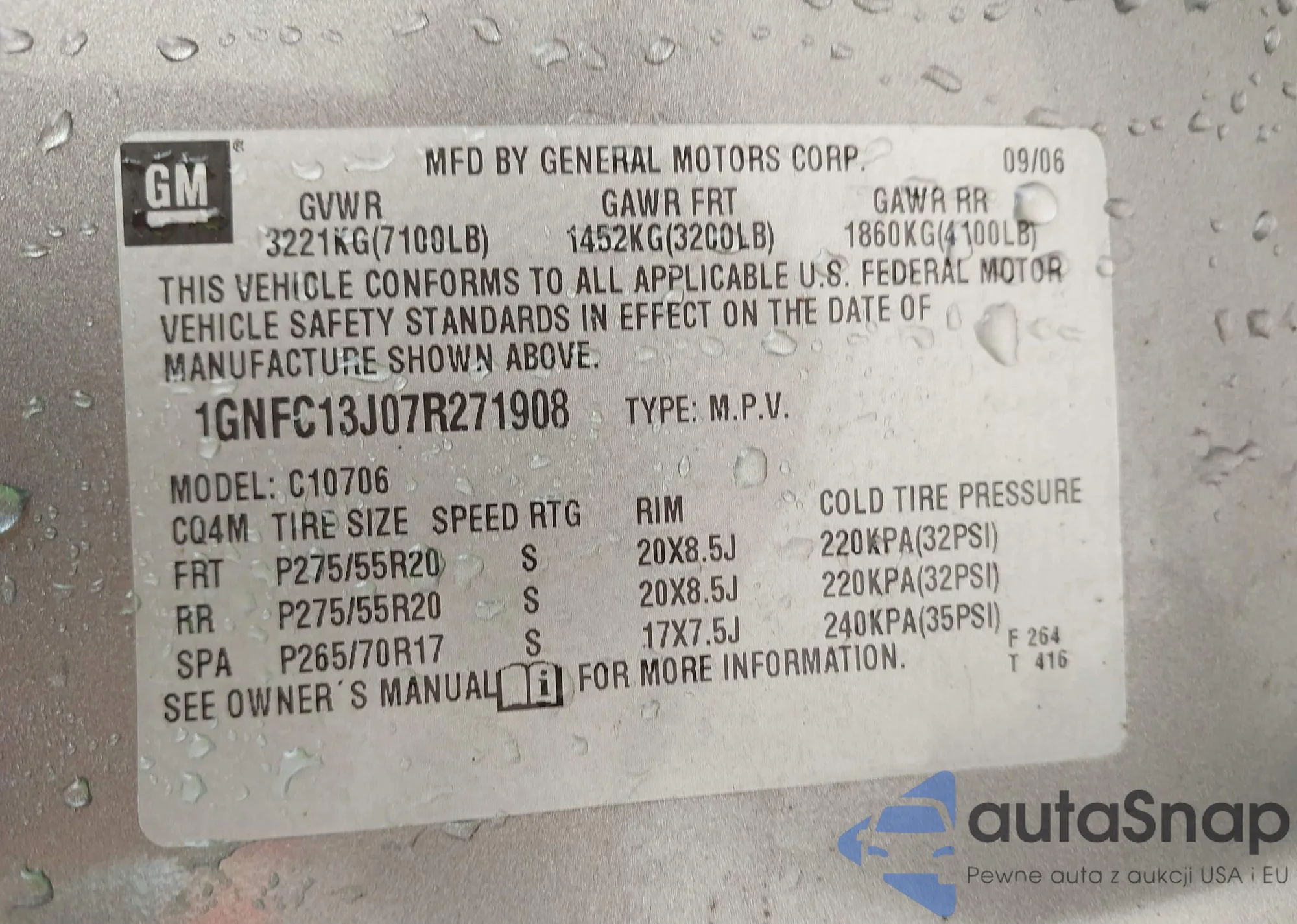 Автомобиль Chevrolet Tahoe 2007 (VIN 1GNFC13J07R271908) ранее не участвовал в торгах. Документы чистые, пробег соответствует или ниже среднего по рынку. Продаётся страховой компанией — рекомендуем покупку. Доставка в порт займет около 6–8 недель.