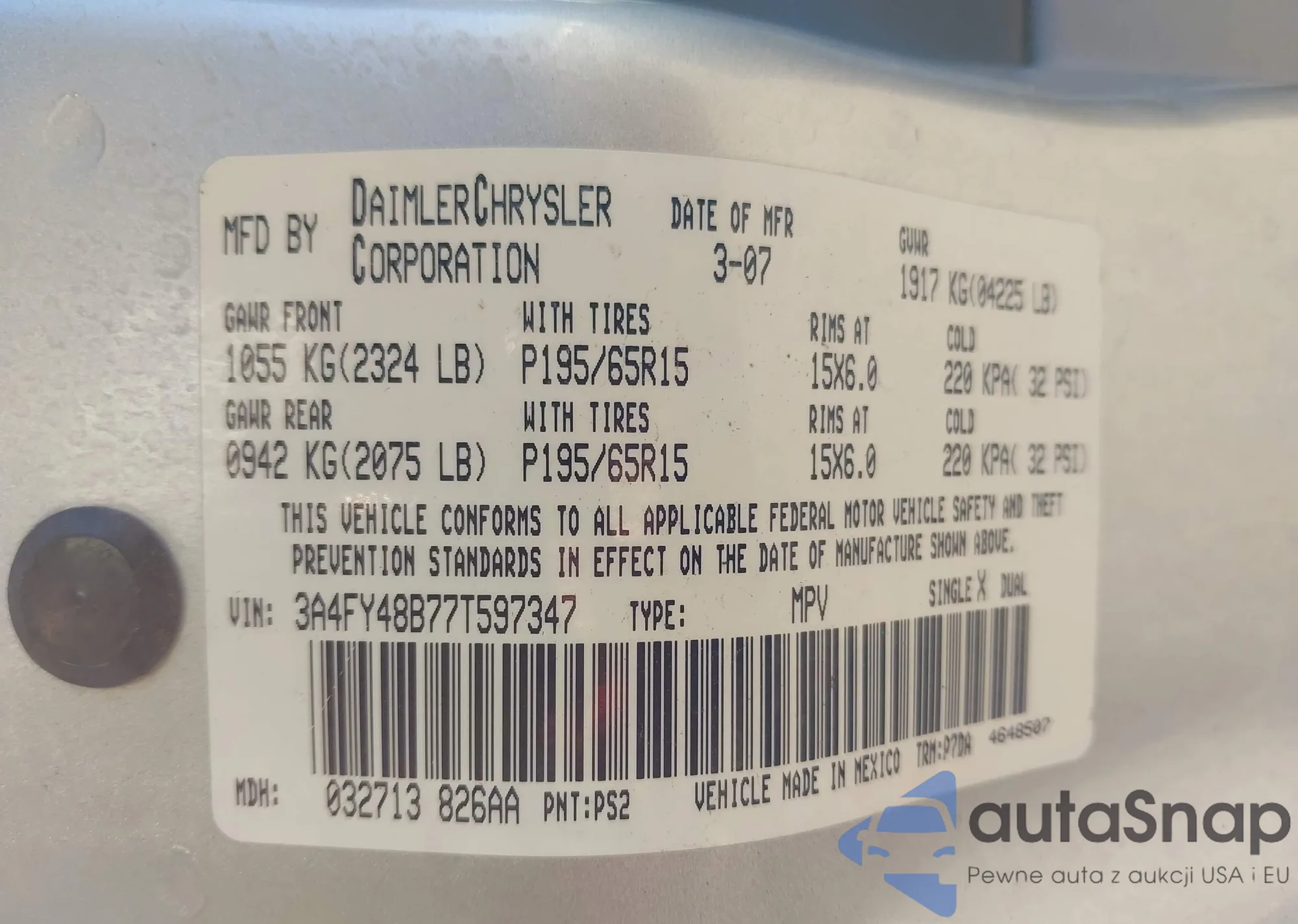 Автомобиль Chrysler PT Cruiser 2007 (VIN 3A4FY48B77T597347) продаётся непроверенным продавцом. Рекомендуем проверить отчет Carfax и подтвердить возможность регистрации перед покупкой.