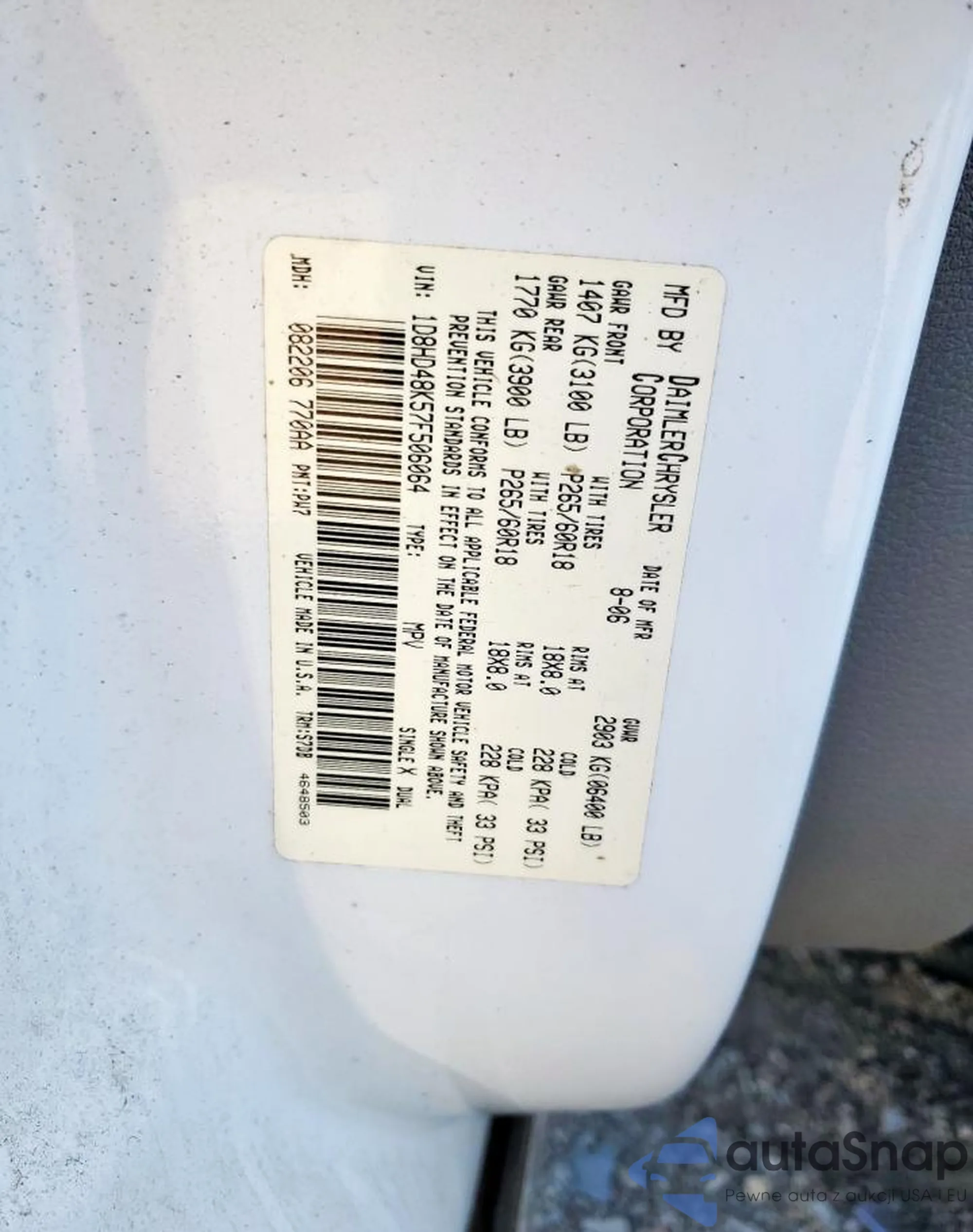 Автомобиль Dodge Durango 2007 (VIN 1D8HD48K57F506064) имеет документы, препятствующие регистрации. Могут возникнуть сложности при экспорте и регистрации. Обратитесь к экспертам AutaSnap для поиска альтернатив.