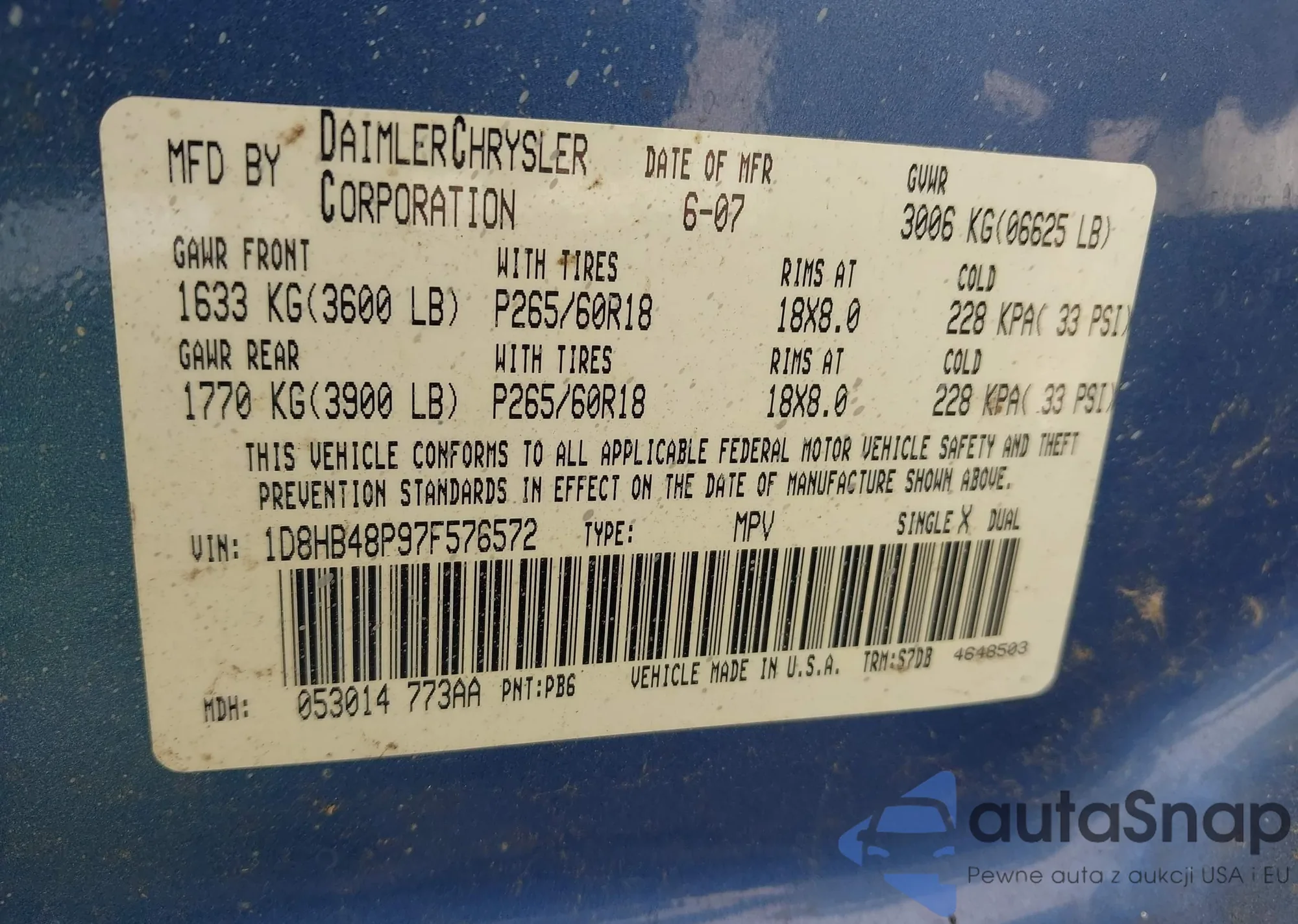 Автомобиль Dodge Durango 2007 (VIN 1D8HB48P97F576572) имеет документы, препятствующие регистрации. Могут возникнуть сложности при экспорте и регистрации. Обратитесь к экспертам AutaSnap для поиска альтернатив.
