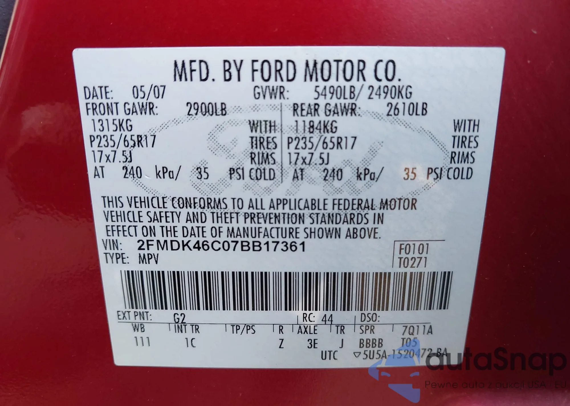 VIN: 2FMDK46C07BB17361