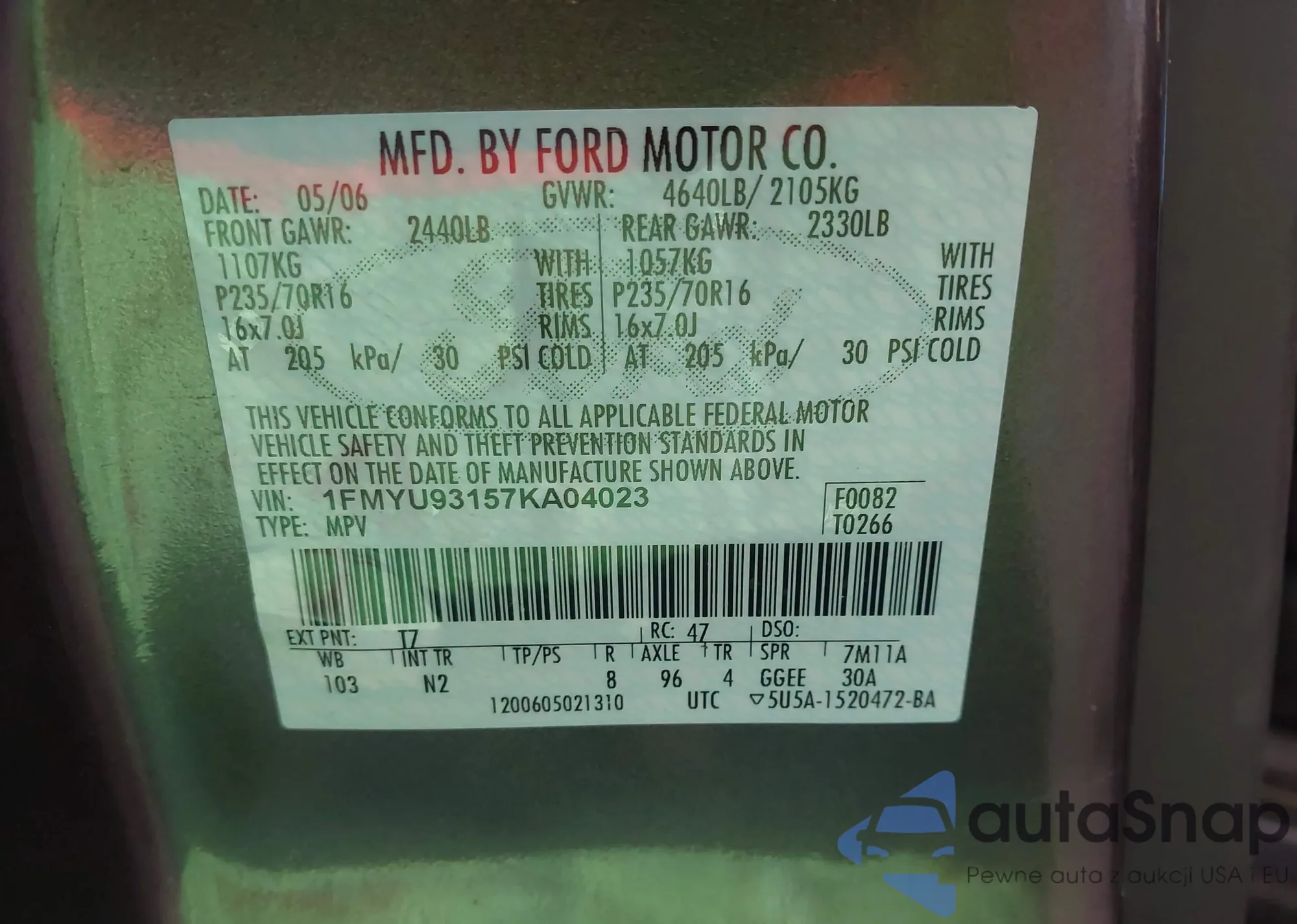 VIN: 1FMYU93157KA04023