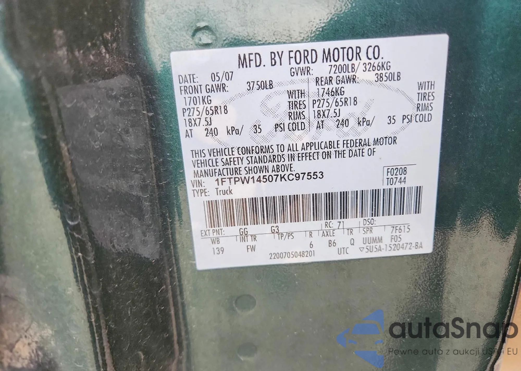 VIN: 1FTPW14507KC97553