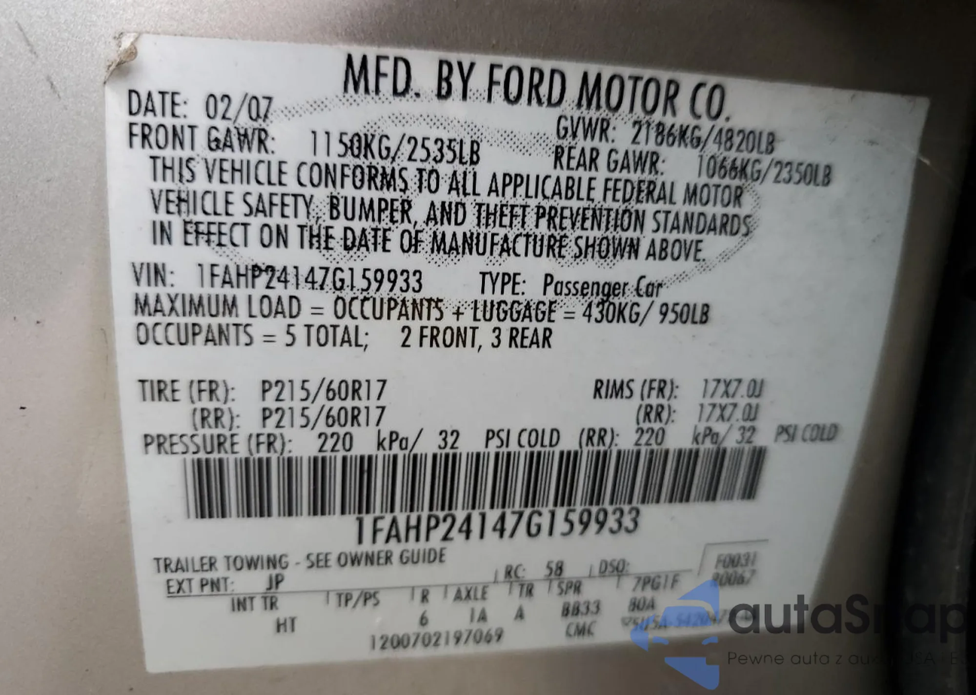 Автомобиль Ford Five Hundred 2007 (VIN 1FAHP24147G159933) имеет документы, препятствующие регистрации. Могут возникнуть сложности при экспорте и регистрации. Обратитесь к экспертам AutaSnap для поиска альтернатив.