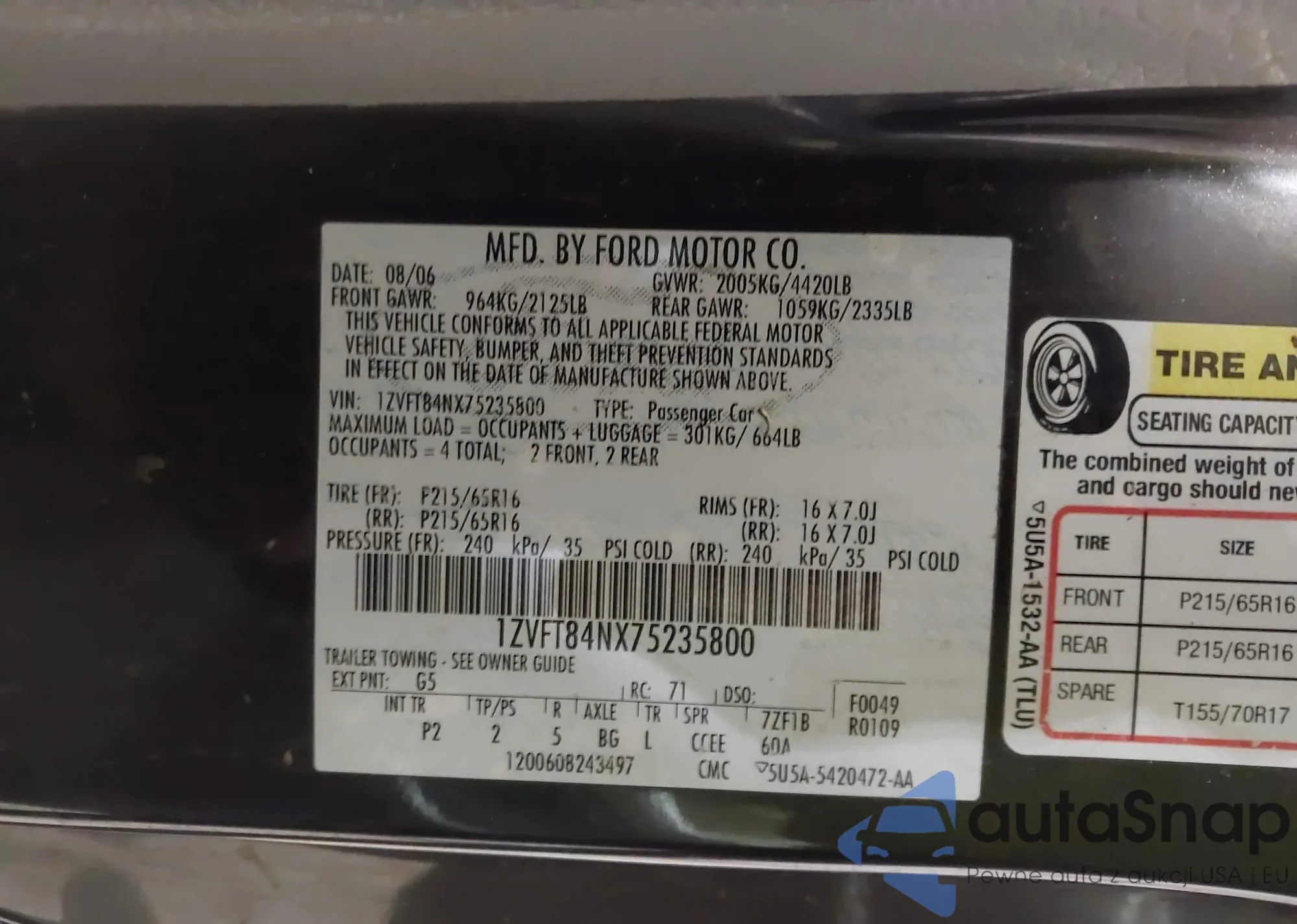 Автомобиль Ford Mustang 2007 (VIN 1ZVFT84NX75235800) ранее не участвовал в торгах. Документы чистые, пробег соответствует или ниже среднего по рынку. Продаётся страховой компанией — рекомендуем покупку. Доставка в порт займет около 6–8 недель.