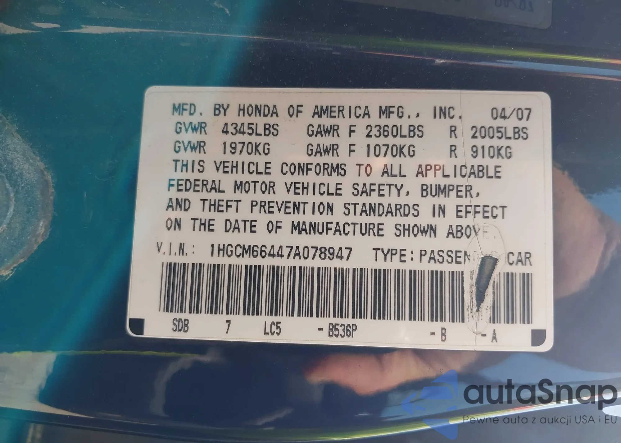 VIN: 1HGCM66447A078947