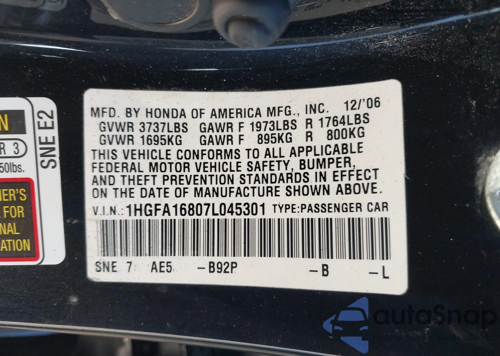 • VIN: 1HGFA16807L045301