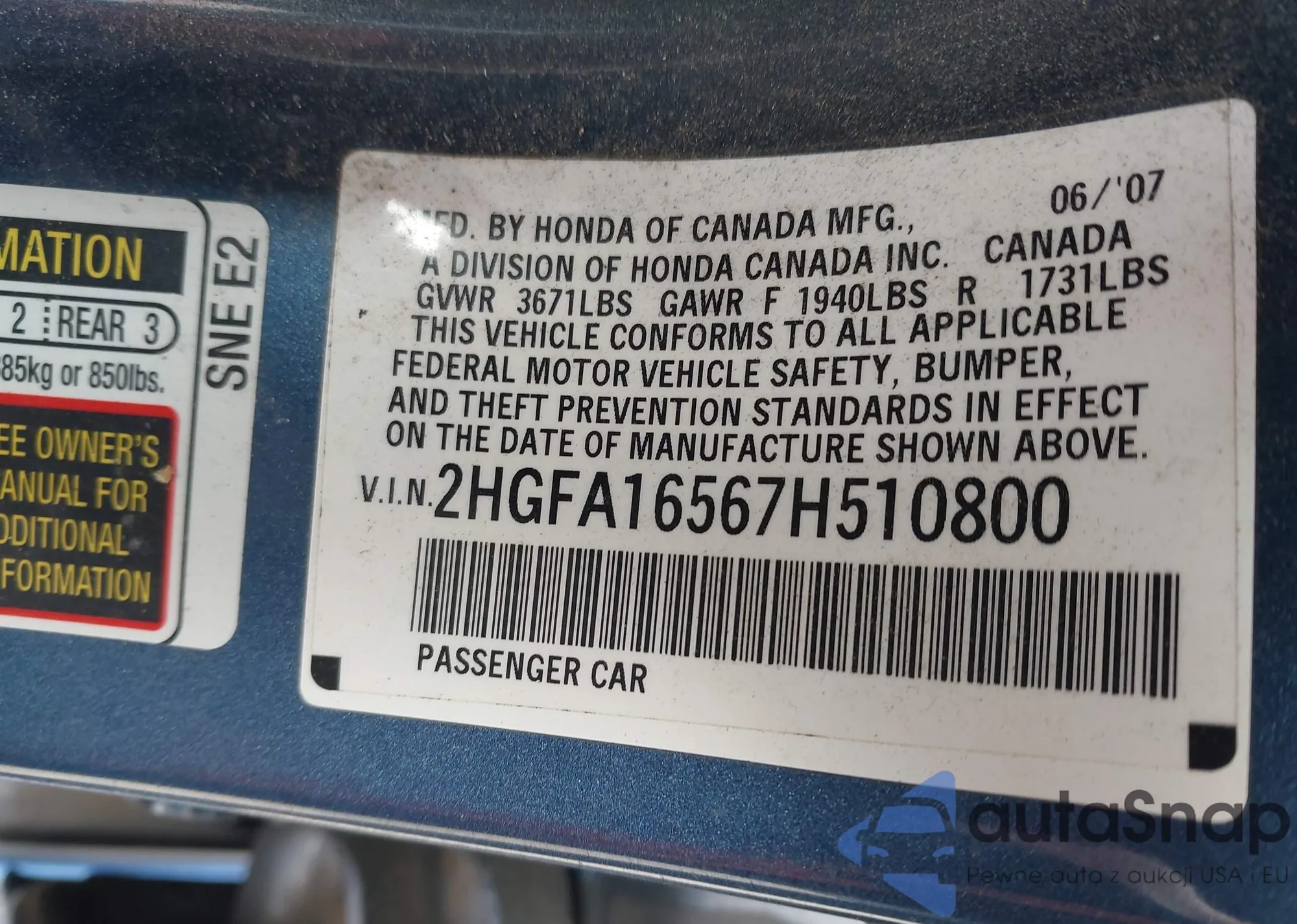VIN: 2HGFA16567H510800