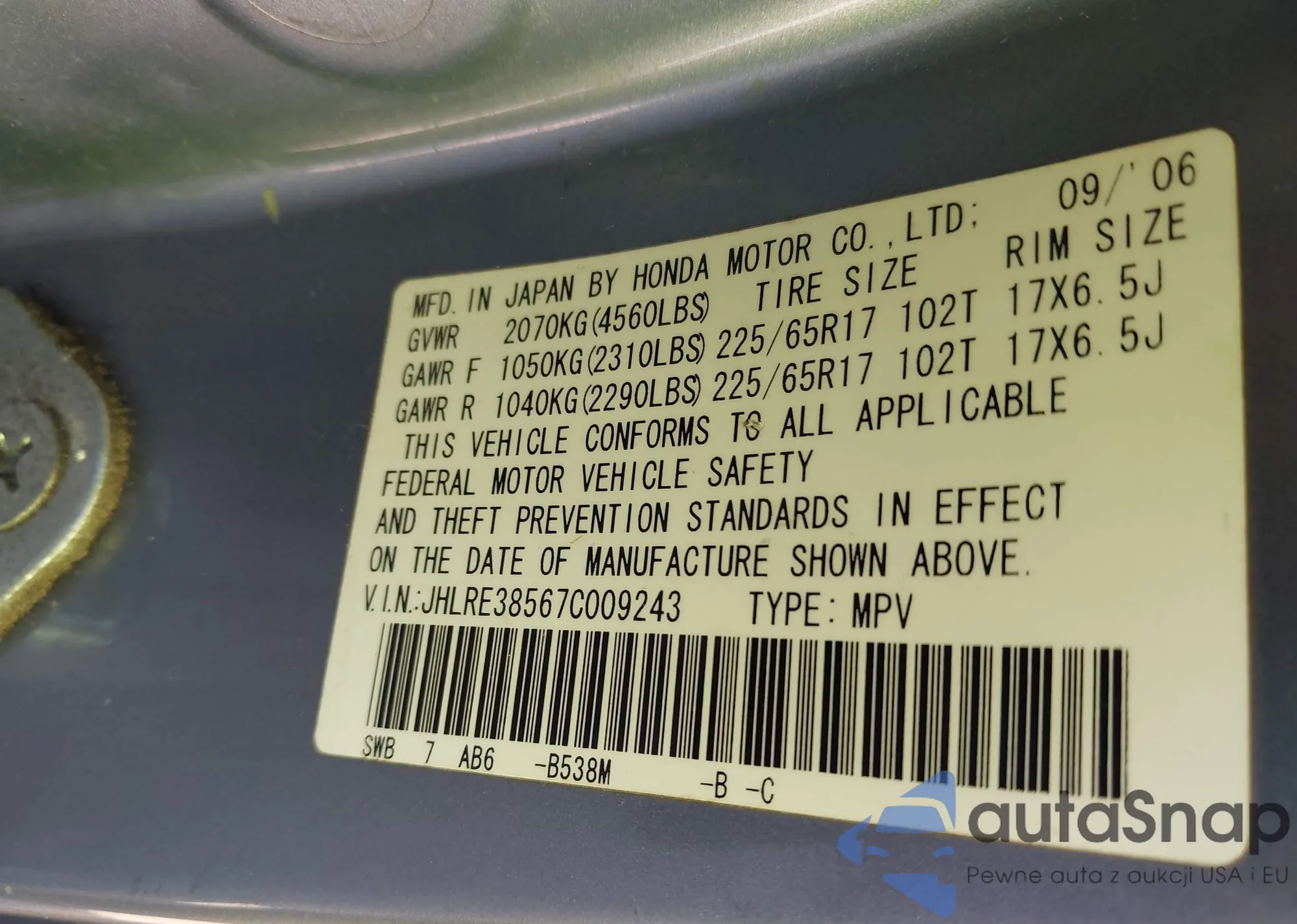 VIN: JHLRE38567C009243