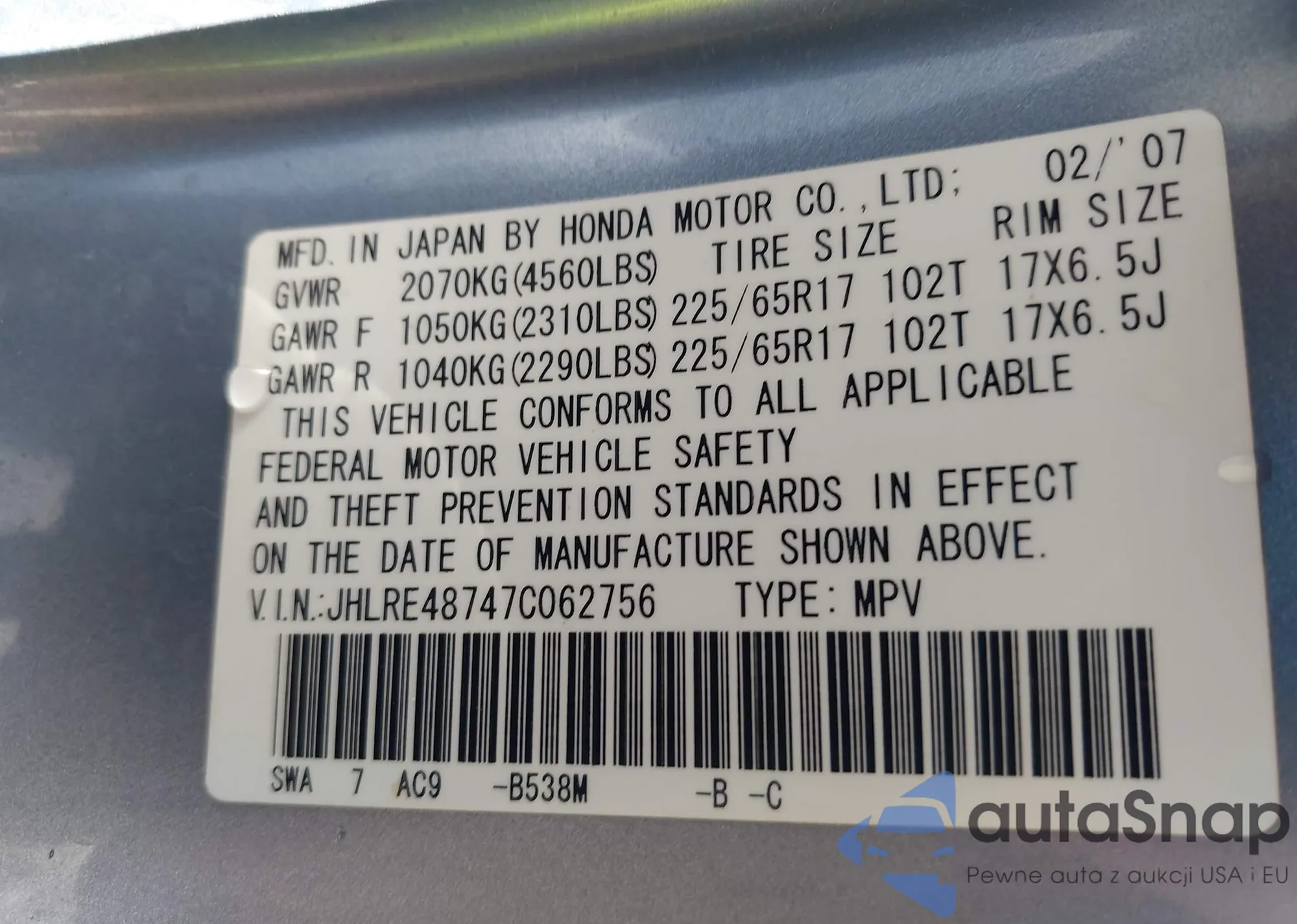 VIN: JHLRE48747C062756