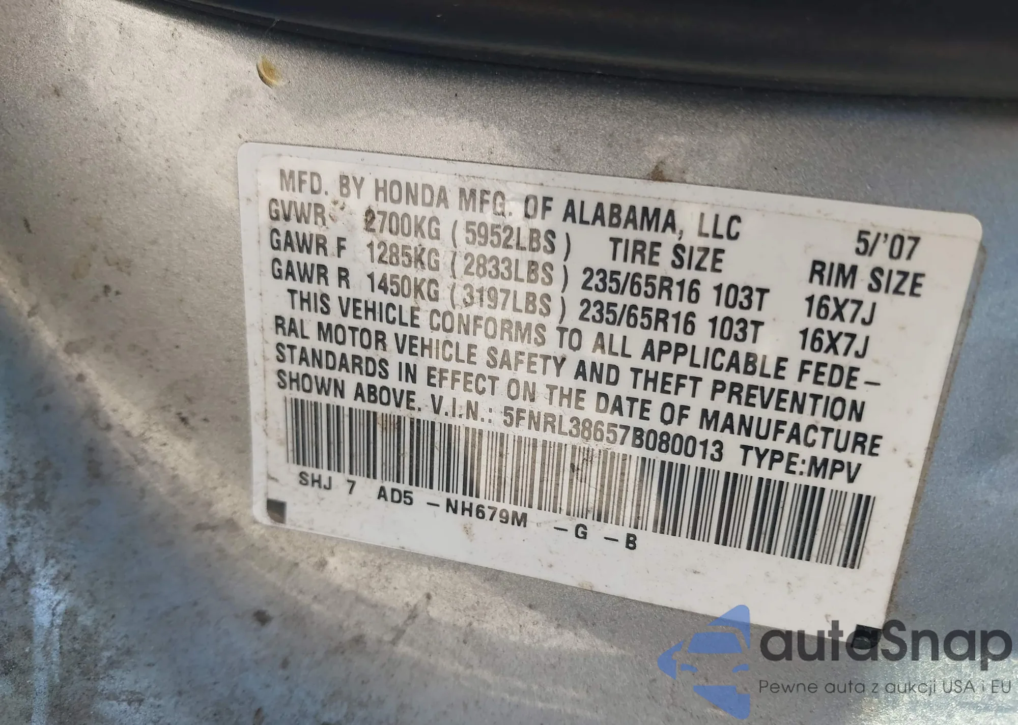 VIN: 5FNRL38657B080013