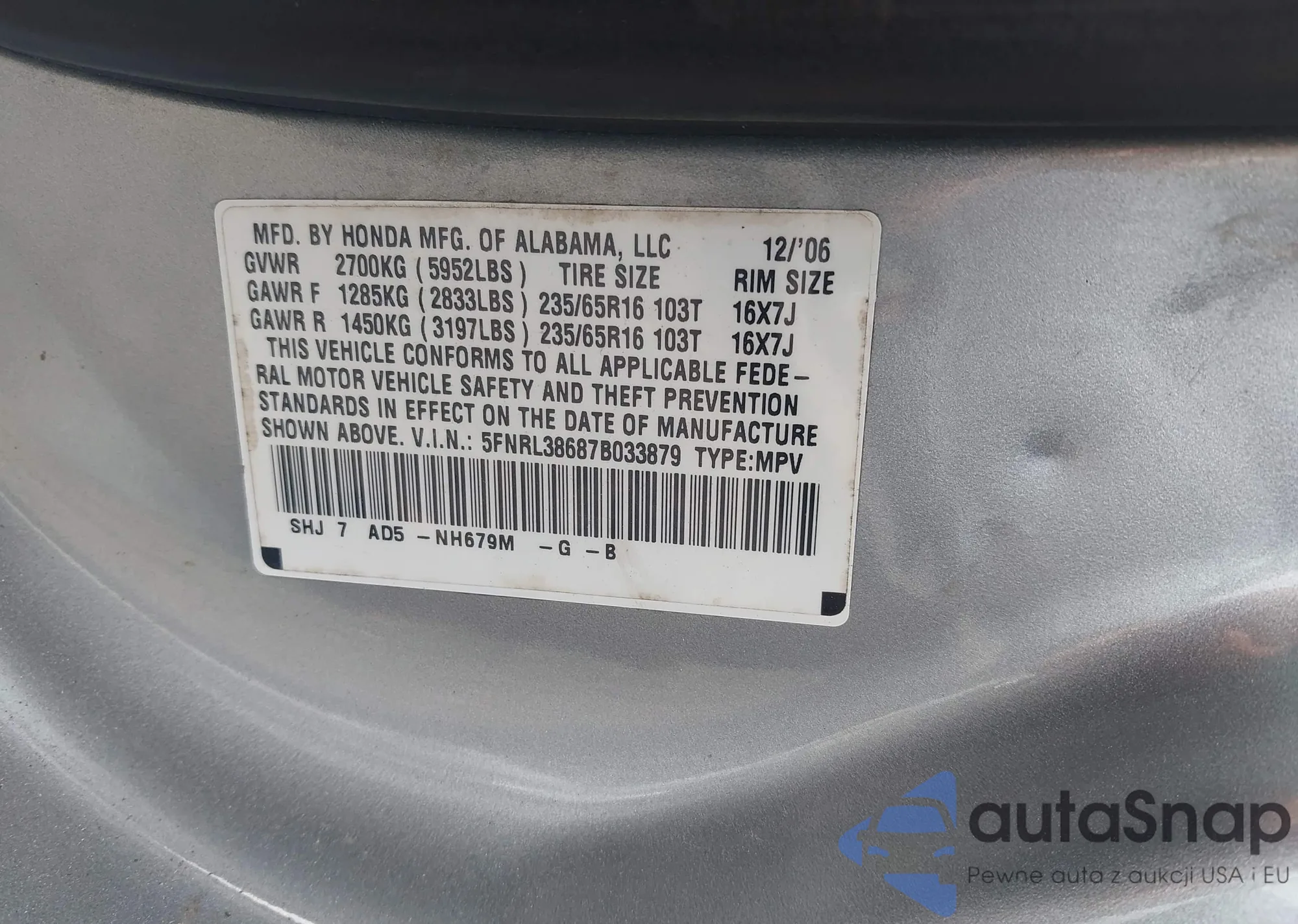 VIN: 5FNRL38687B033879