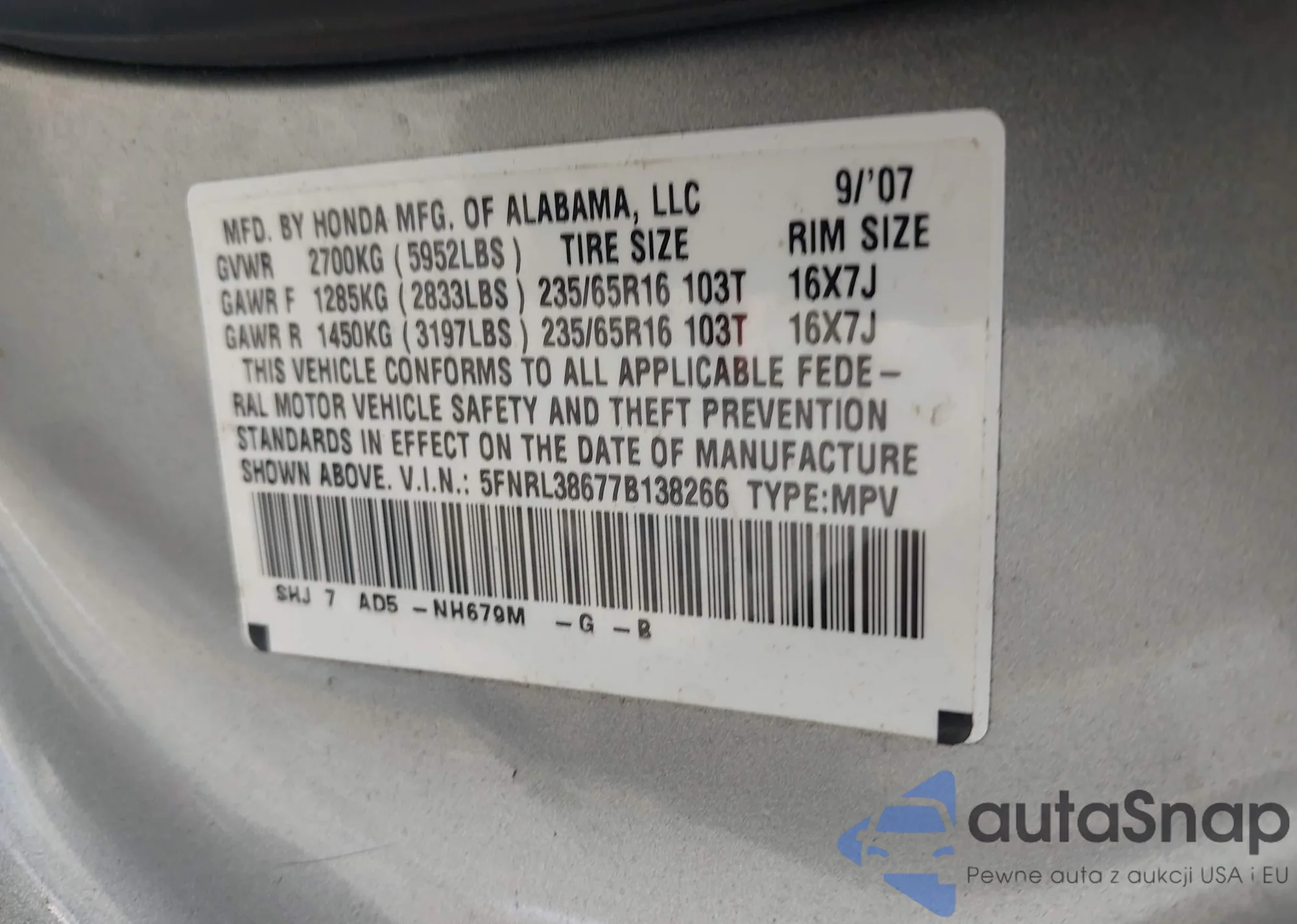 VIN: 5FNRL38677B138266