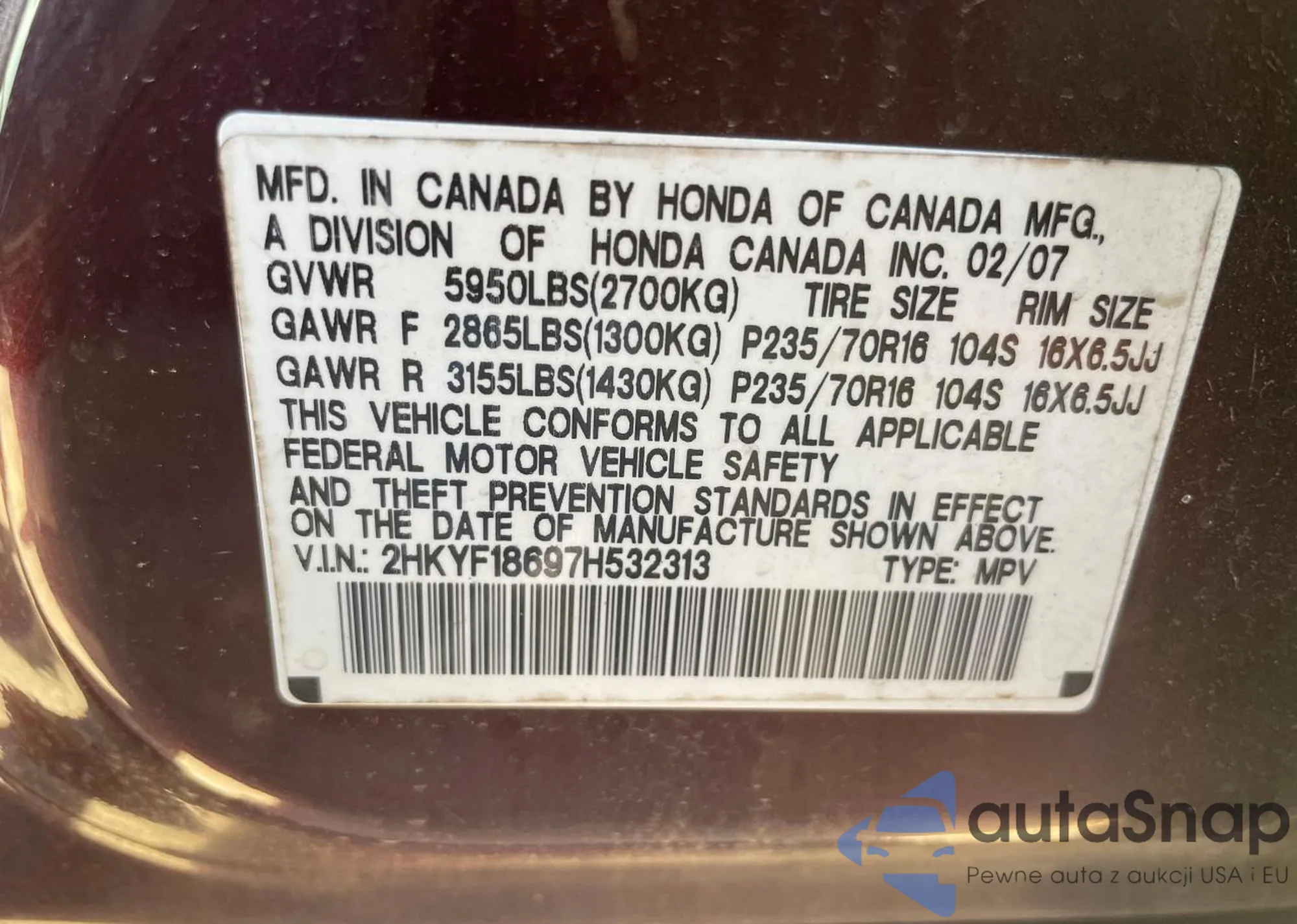 VIN: 2HKYF18697H532313