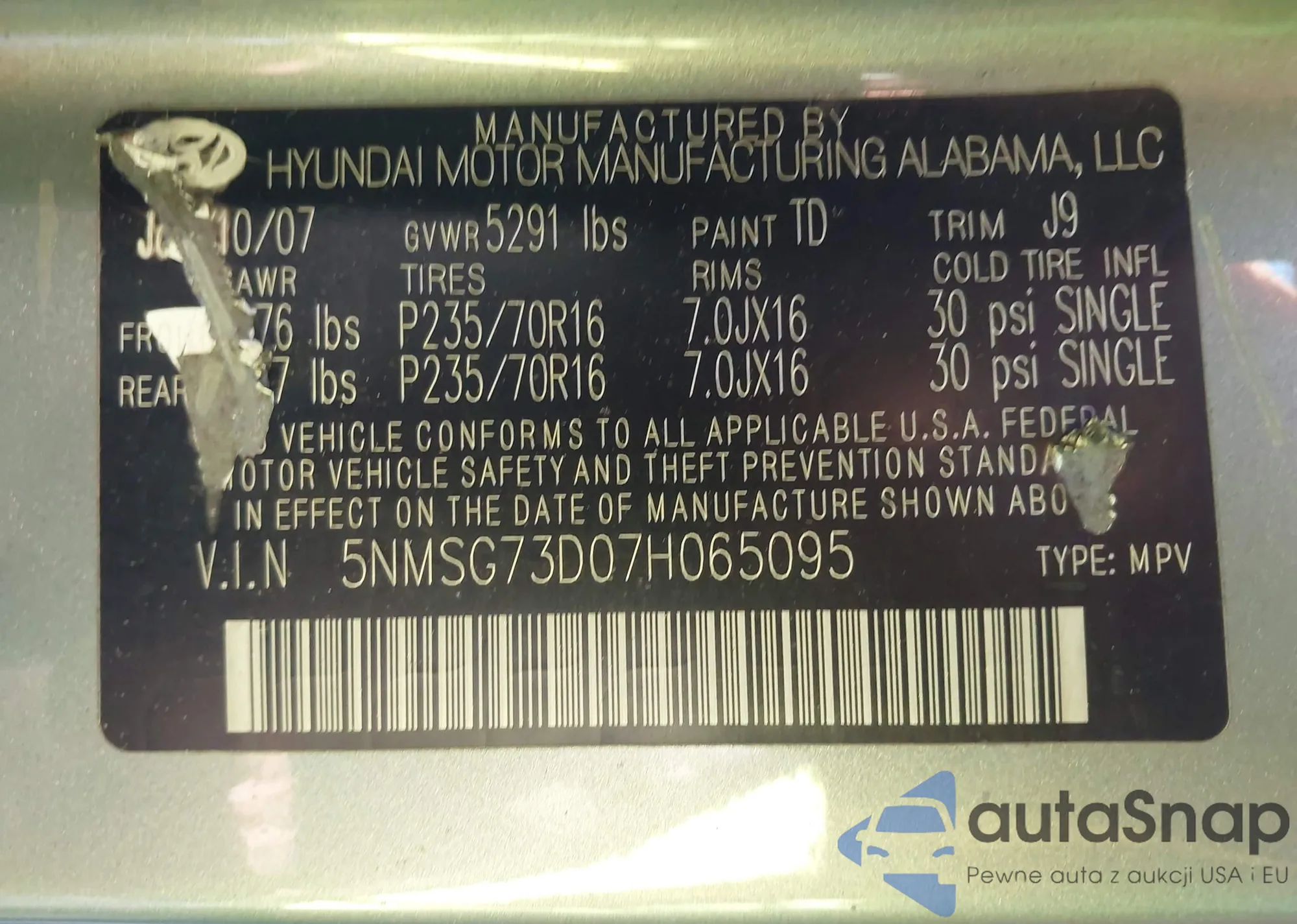 VIN: 5NMSG73D07H065095