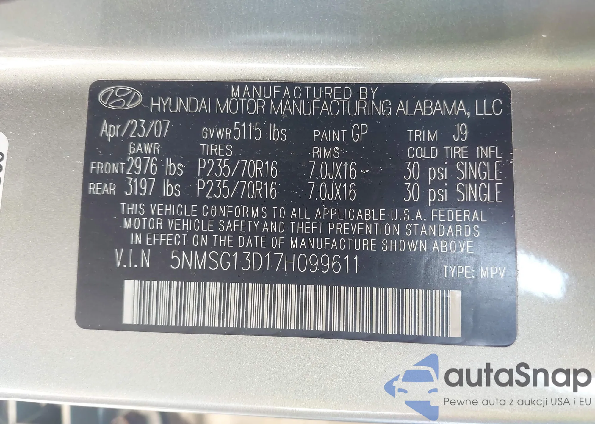 VIN: 5NMSG13D17H099611