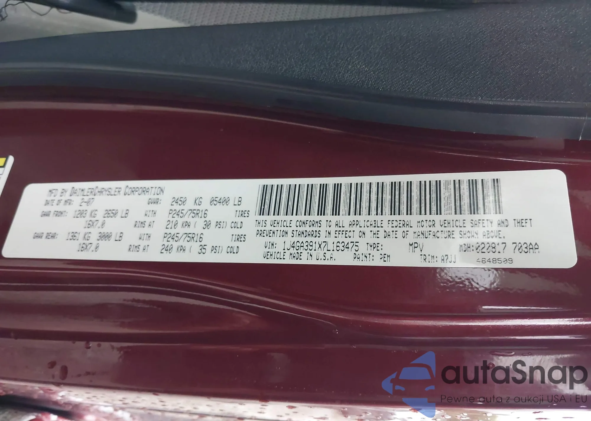 Автомобиль Jeep Wrangler 2007 (VIN 1J4GA391X7L163475) имеет документы, препятствующие регистрации. Могут возникнуть сложности при экспорте и регистрации. Обратитесь к экспертам AutaSnap для поиска альтернатив.