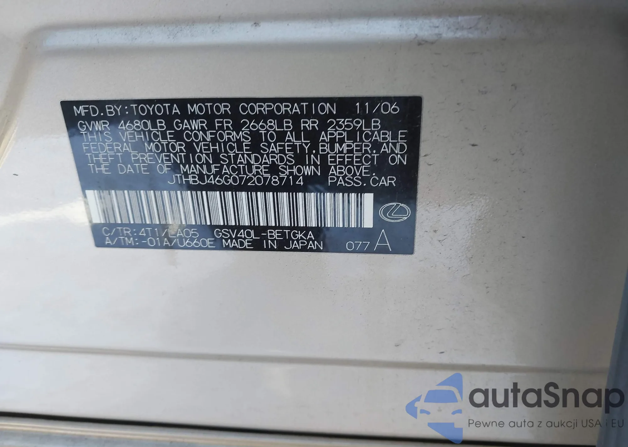 VIN: JTHBJ46G072078714
