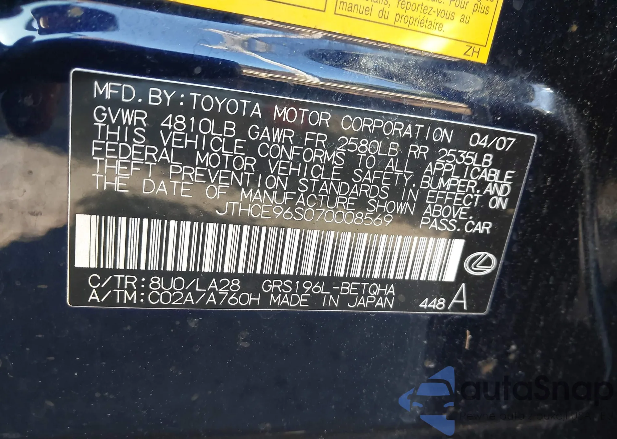 VIN: JTHCE96S070008569