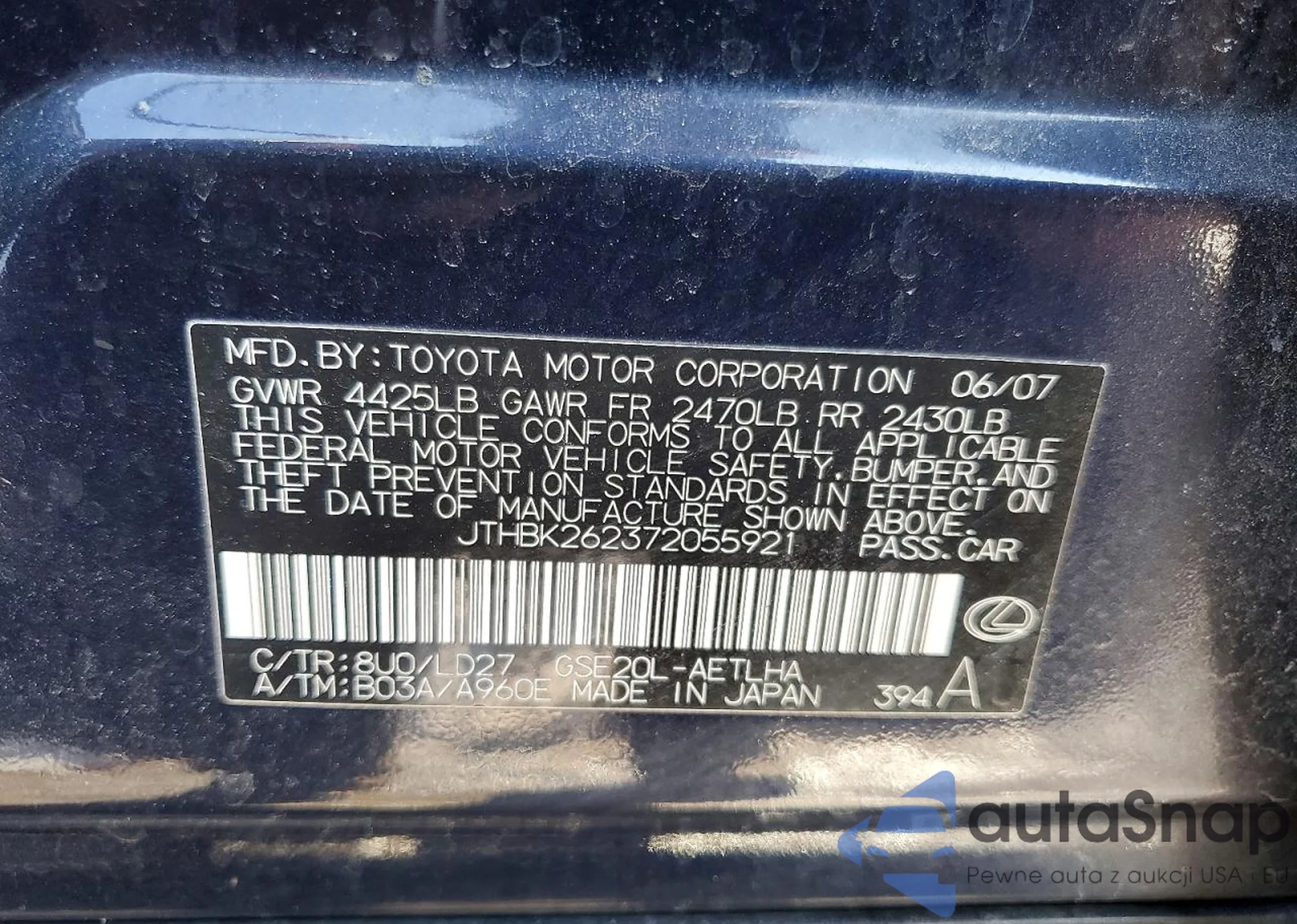 Lexus IS 2007 – История автомобиля (продан на COPART)