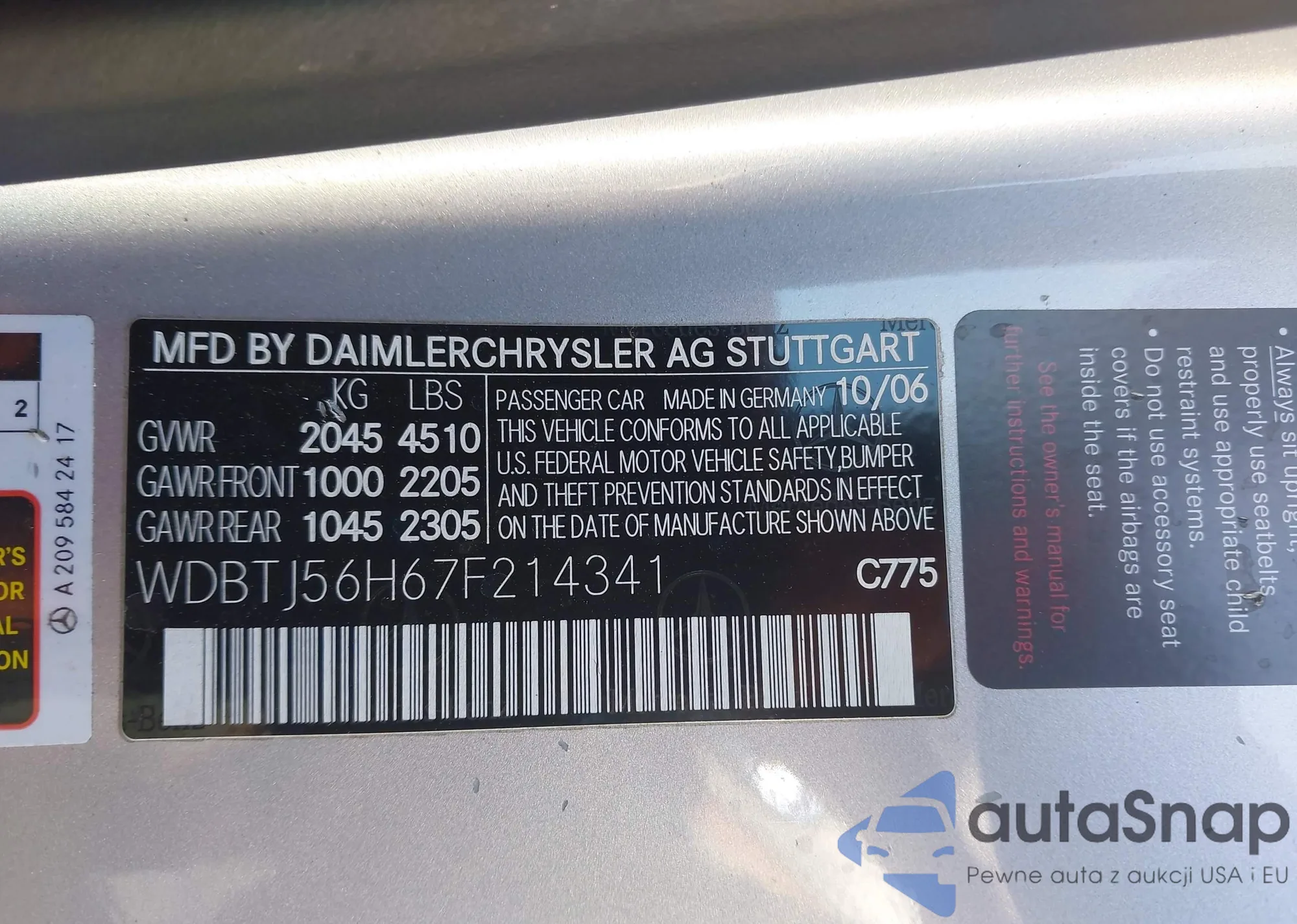 Автомобиль Mercedes-Benz CLK-klasse 2007 (VIN WDBTJ56H67F214341) ранее не участвовал в торгах. Документы чистые, пробег соответствует или ниже среднего по рынку. Продаётся страховой компанией — рекомендуем покупку. Доставка в порт займет около 6–8 недель.