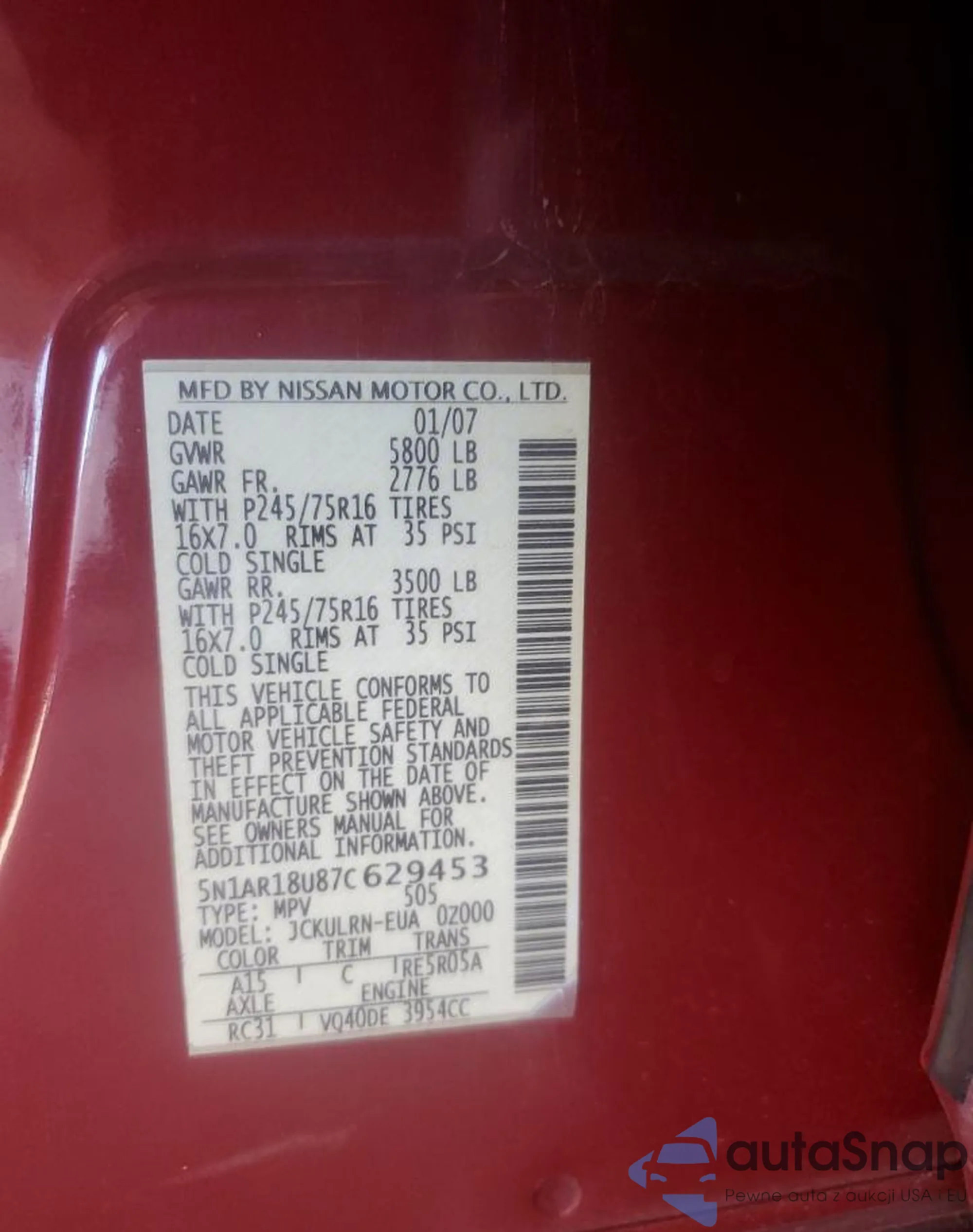 VIN: 5N1AR18U87C629453