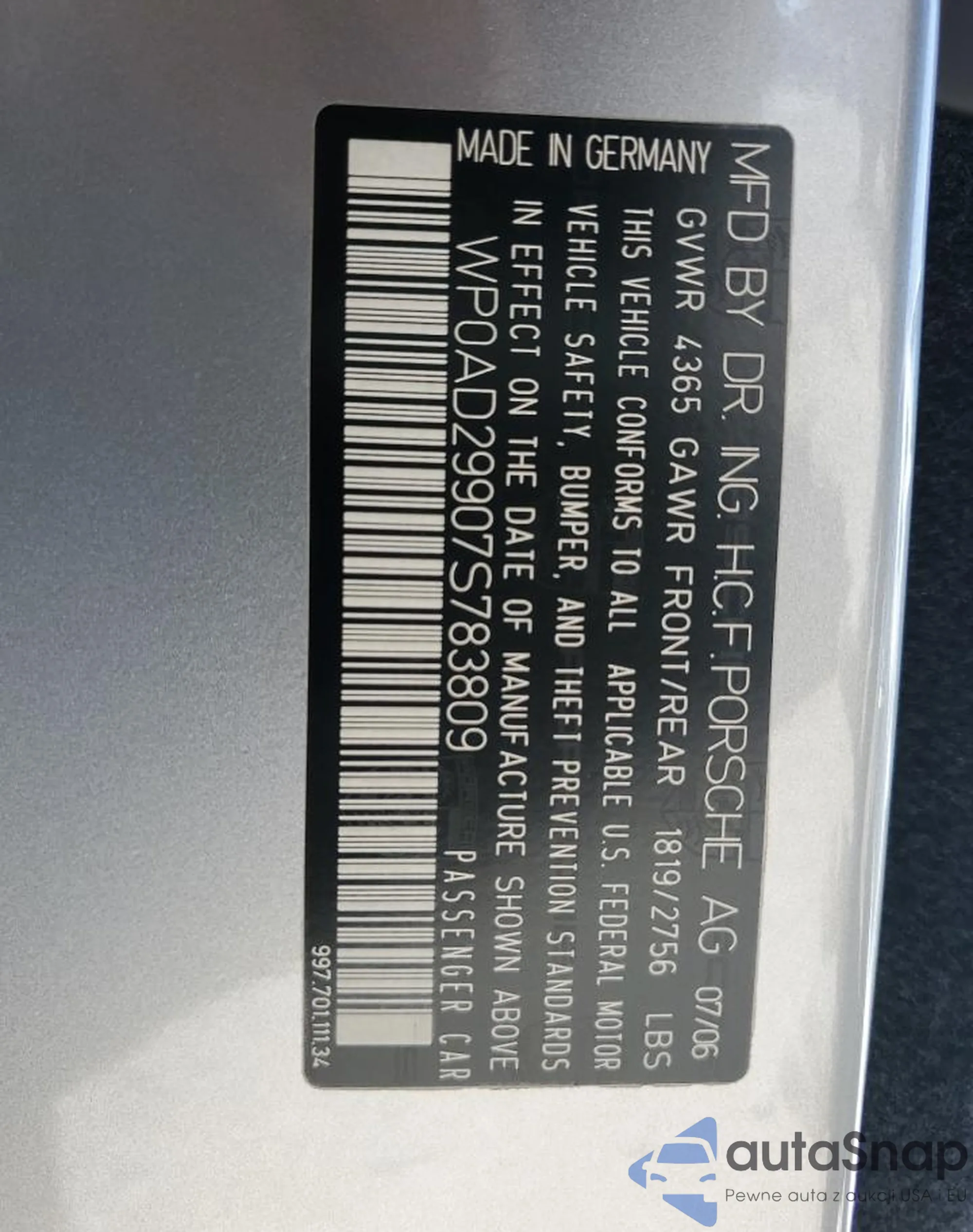 Автомобиль Porsche 911 2007 (VIN WP0AD29907S783809) имеет документы, препятствующие регистрации. Могут возникнуть сложности при экспорте и регистрации. Обратитесь к экспертам AutaSnap для поиска альтернатив.