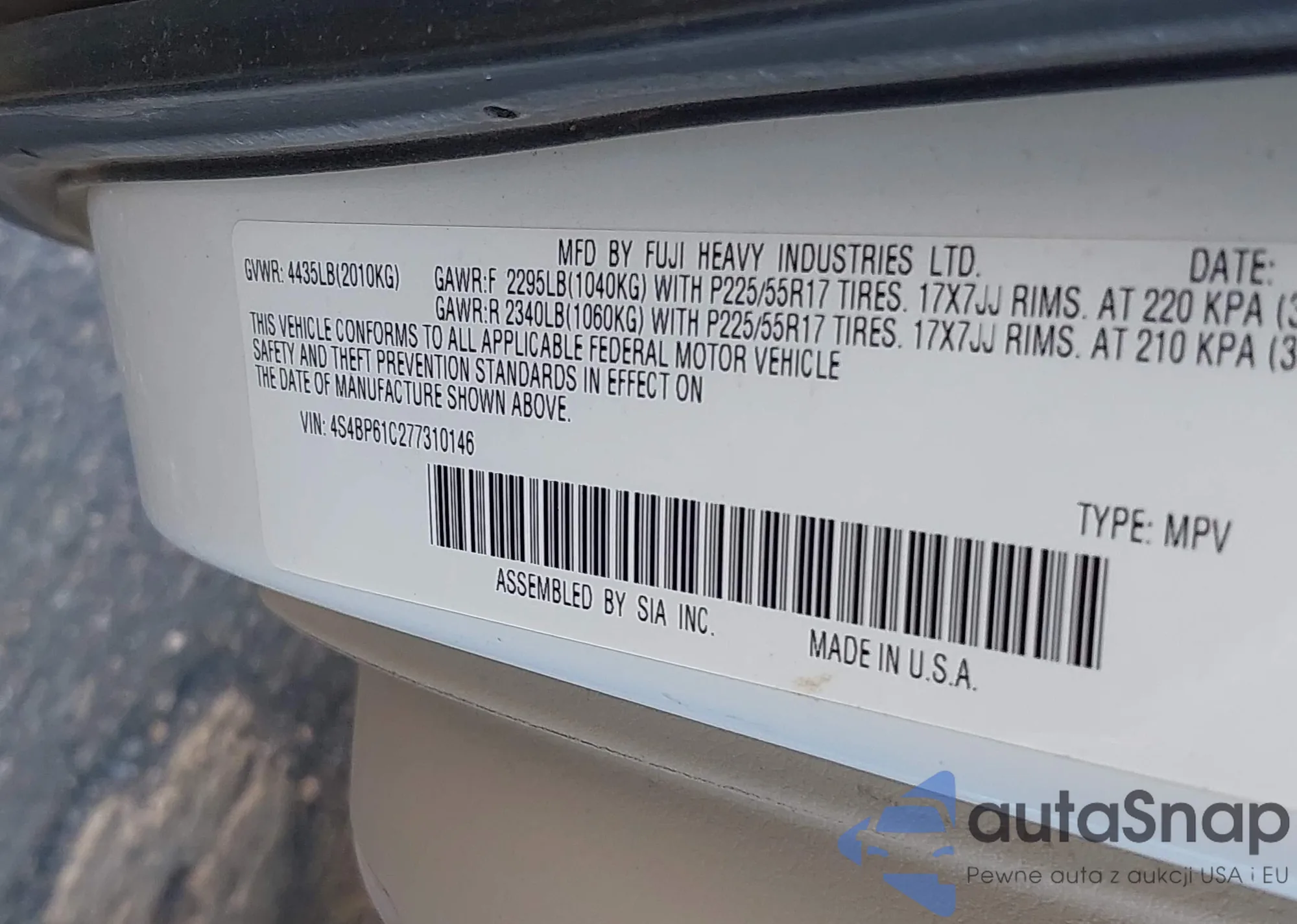 VIN: 4S4BP61C277310146