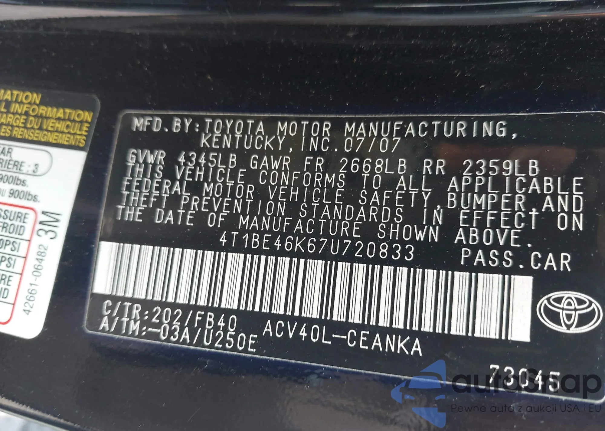 VIN: 4T1BE46K67U720833