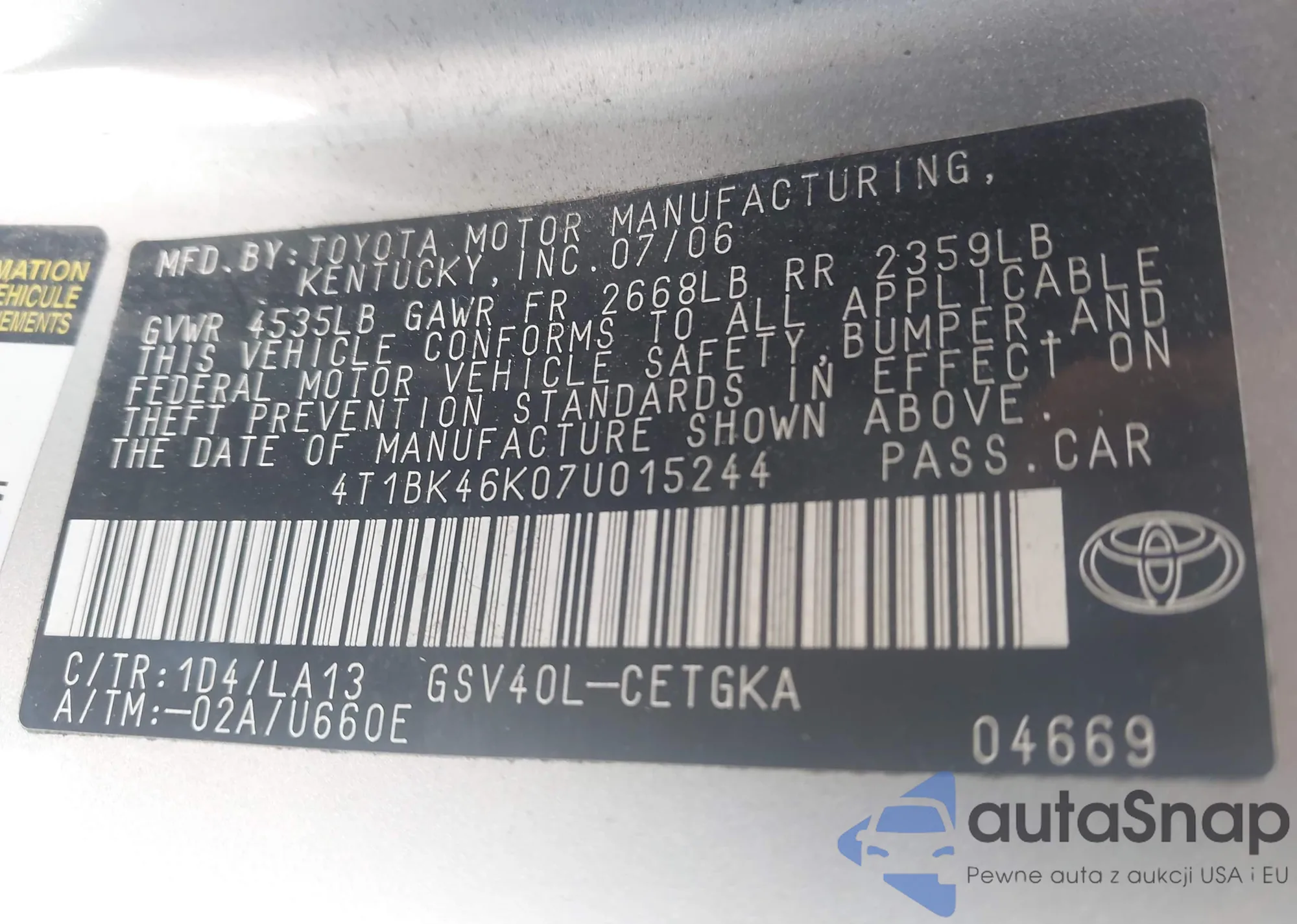 VIN: 4T1BK46K07U015244