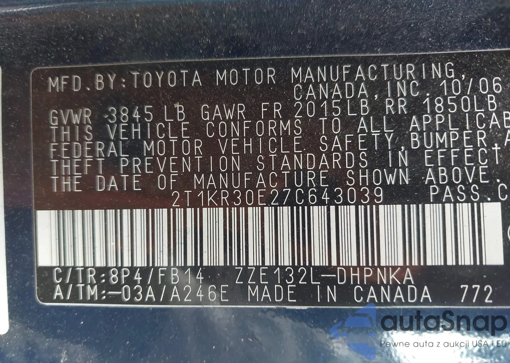 Автомобиль Toyota Matrix 2007 (VIN 2T1KR30E27C643039) имеет документы, препятствующие регистрации. Могут возникнуть сложности при экспорте и регистрации. Обратитесь к экспертам AutaSnap для поиска альтернатив.
