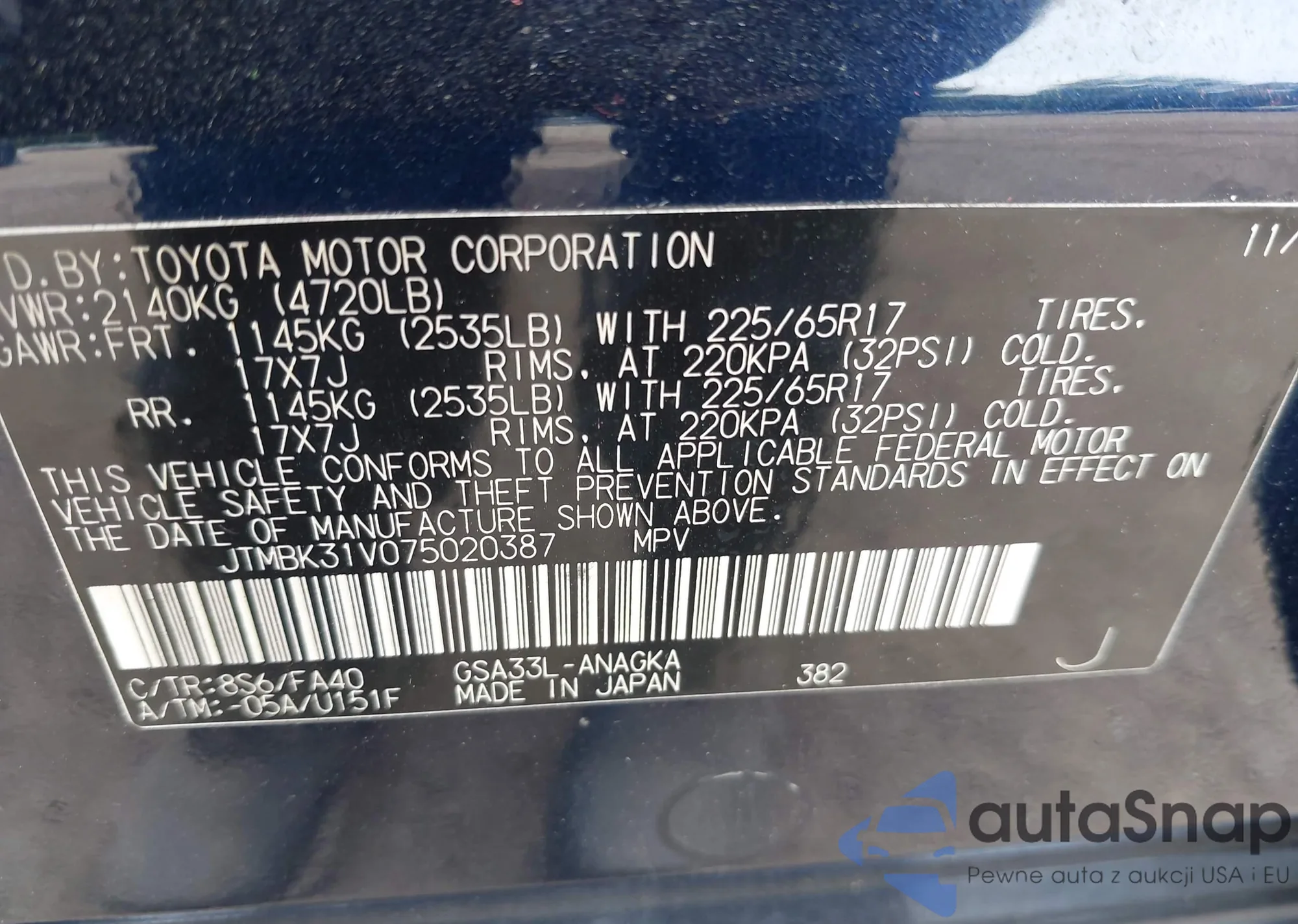 VIN: JTMBK31V075020387