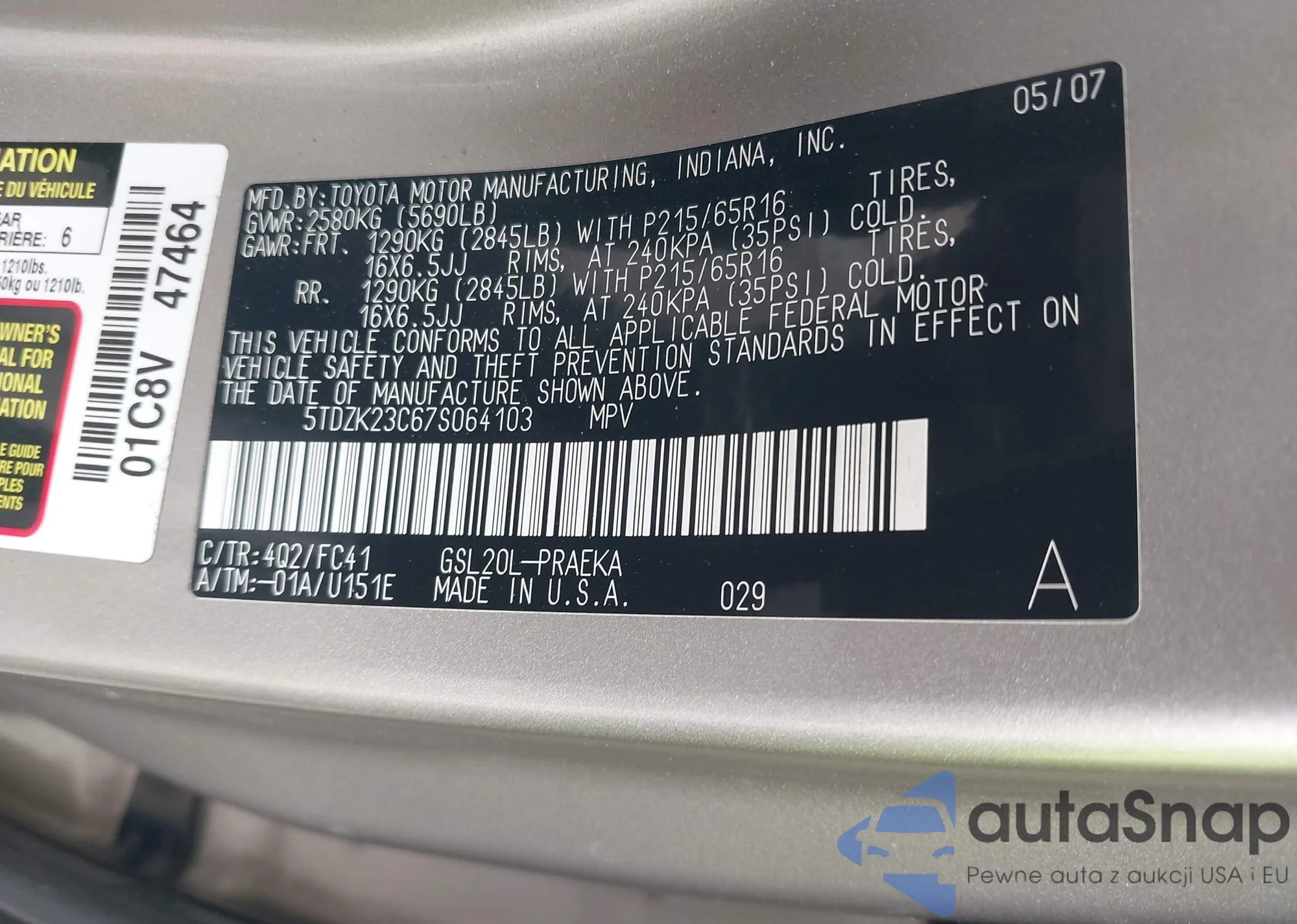 Автомобиль Toyota Sienna 2007 (VIN 5TDZK23C67S064103) ранее не участвовал в торгах. Документы чистые, пробег соответствует или ниже среднего по рынку. Продаётся страховой компанией — рекомендуем покупку. Доставка в порт займет около 6–8 недель.