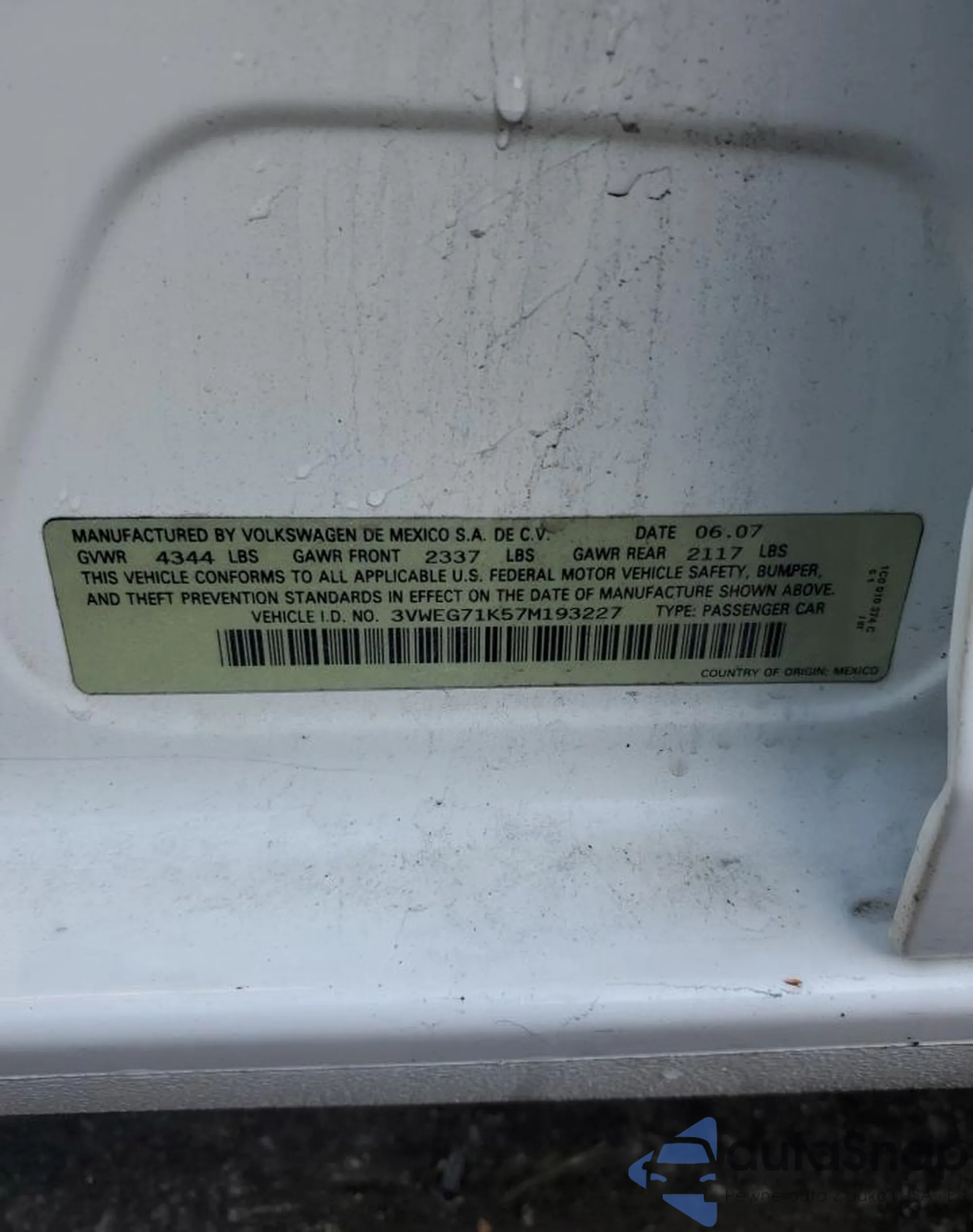 VIN: 3VWEG71K57M193227
