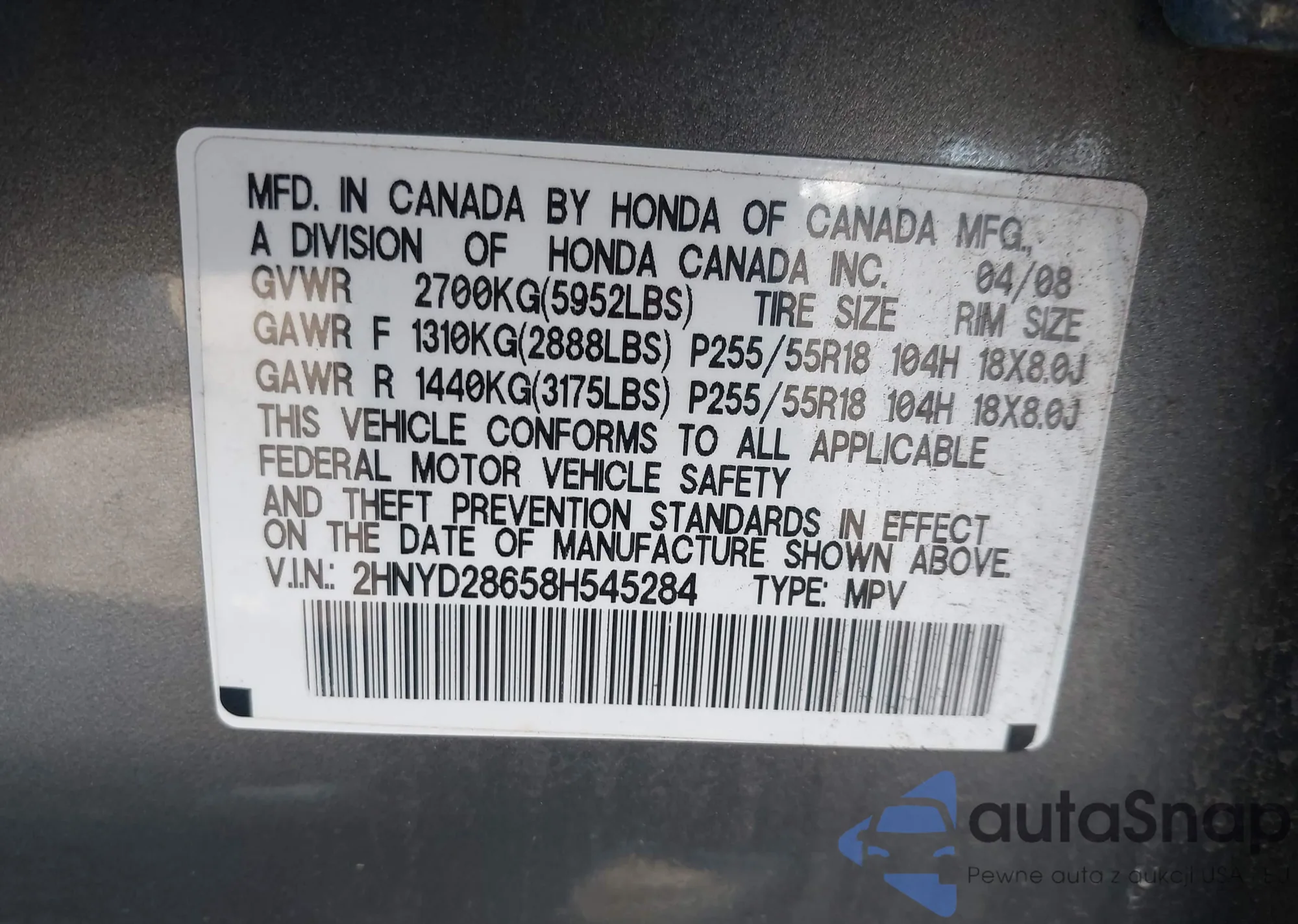 VIN: 2HNYD28658H545284