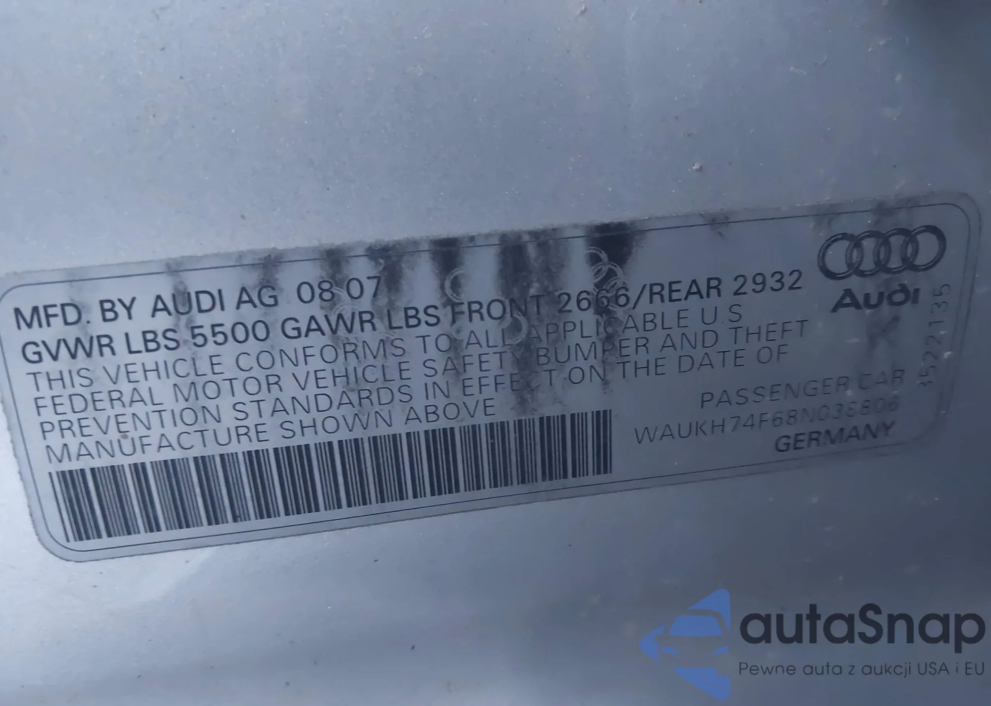 Автомобиль Audi A6 2008 (VIN WAUKH74F68N038806) ранее не участвовал в торгах. Документы чистые, пробег соответствует или ниже среднего по рынку. Продаётся страховой компанией — рекомендуем покупку. Доставка в порт займет около 6–8 недель.