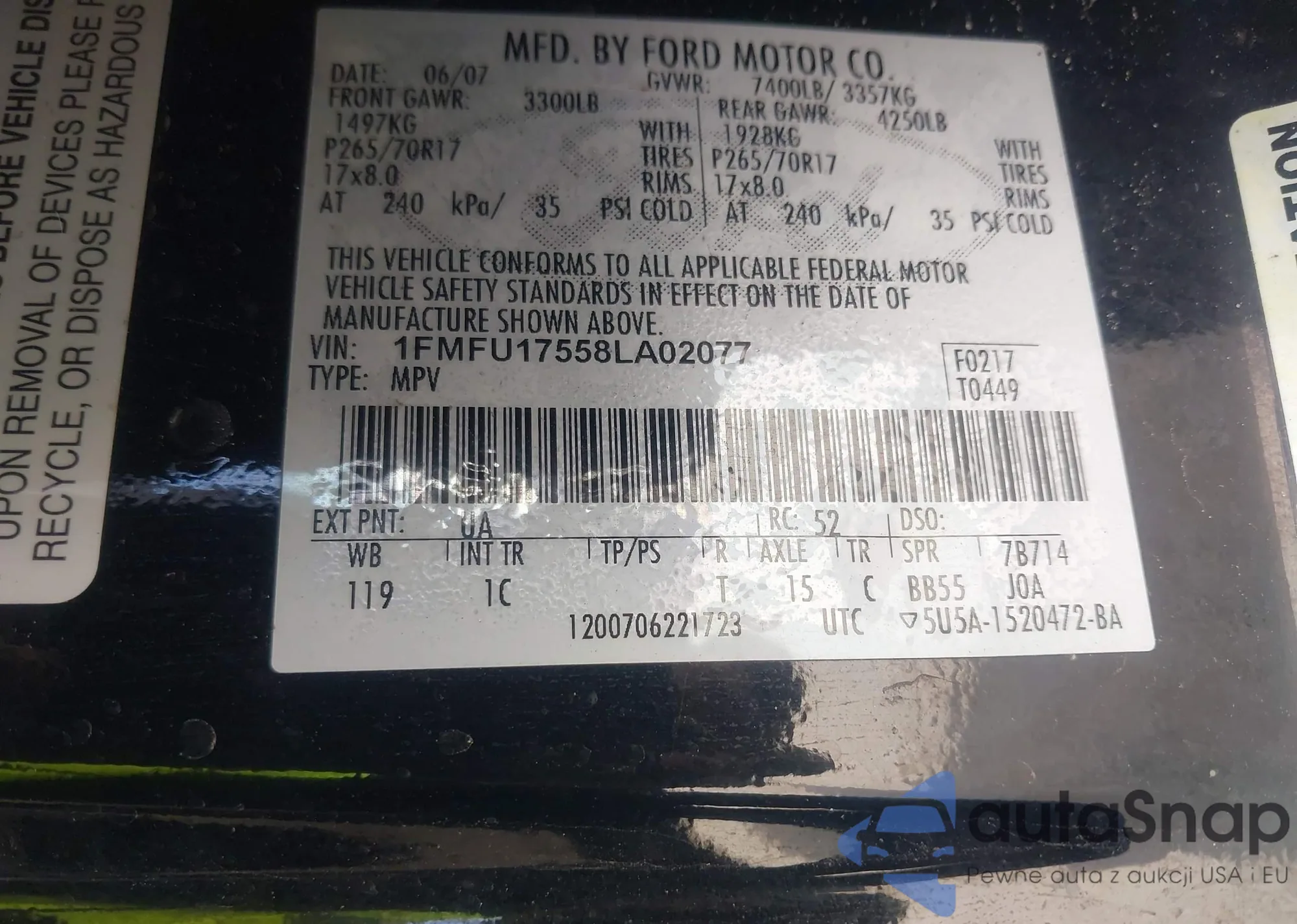 • VIN: 1FMFU17558LA02077
